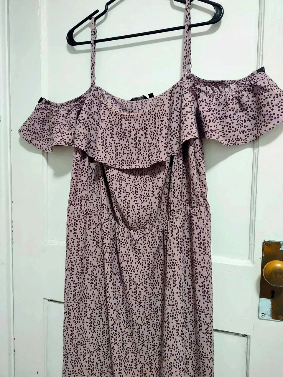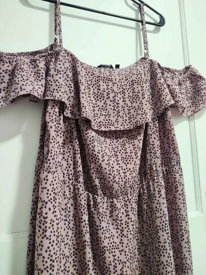 21Size: 3X (wore it as an XL) Style: Off-shoulder with ruffle detail Color/Pattern: Soft mauve with dark speckled print Material: Light and flowy – comfortable for warm weather Condition: Excellent, gently worn, no flaws
