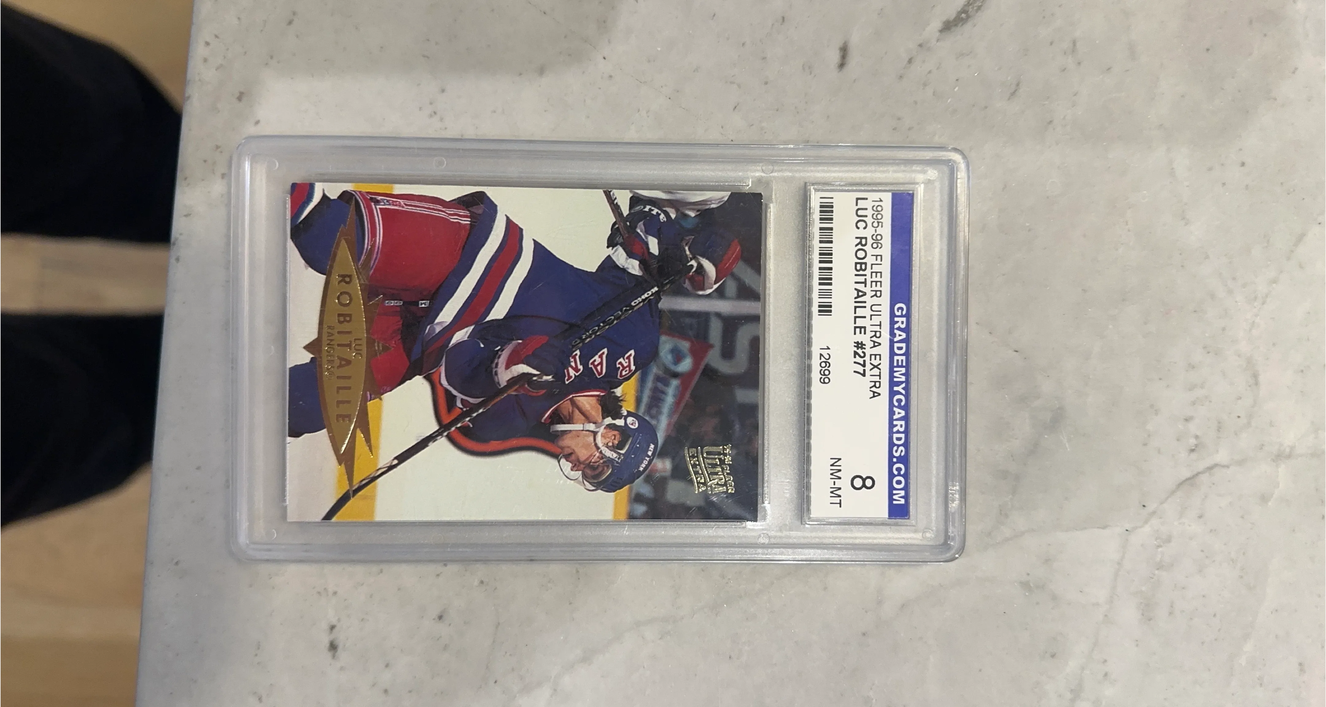 Graded NM-MT 8 by Grademycards.com. This is the 1995-96 Fleer Ultra Extra Luc Robitaille card #277. It features the player in his New York Rangers uniform. This card is a great addition for any hockey card collector!