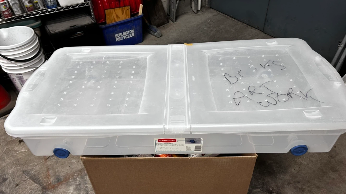 This is a Rubbermaid underbed storage box with wheels. It measures 16.8 gal / 63.6 L and has dimensions of 43 x 19.5 x 6.7 inches. It's designed to fit easily under most beds.