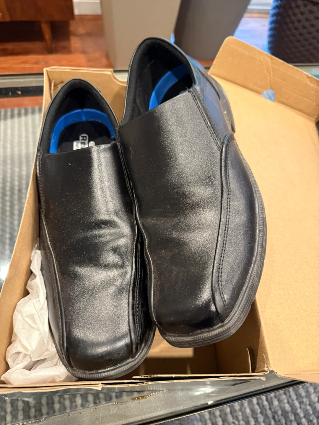 60Selling a pair of Relaxed Fit Skechers slip-on shoes for men in size 12 They are black and come with the original box. These shoes are in great condition and ready for a new home!