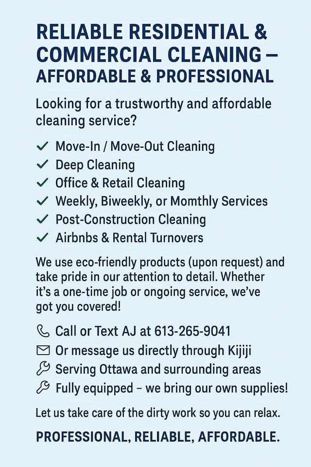 5Looking for a trustworthy and affordable cleaning service? We’re a small local company offering top-quality residential and commercial cleaning at competitive rates. ✅ Move-In / Move-Out Cleaning ✅ Deep Cleaning ✅ Office & Retail Cleaning ✅ Weekly, Biweekly, or Monthly Services ✅ Post-Construction Cleaning ✅ Airbnbs & Rental Turnovers We use eco-friendly products (upon request) and take pride in our attention to detail. Whether it’s a one-time job or ongoing service, we’ve got you covered! Call or Text AJ at [hidden information] Or message us directly through Kijiji Serving Ottawa and surrounding areas Fully equipped – we bring our own supplies! Let us take care of the dirty work so you can relax.