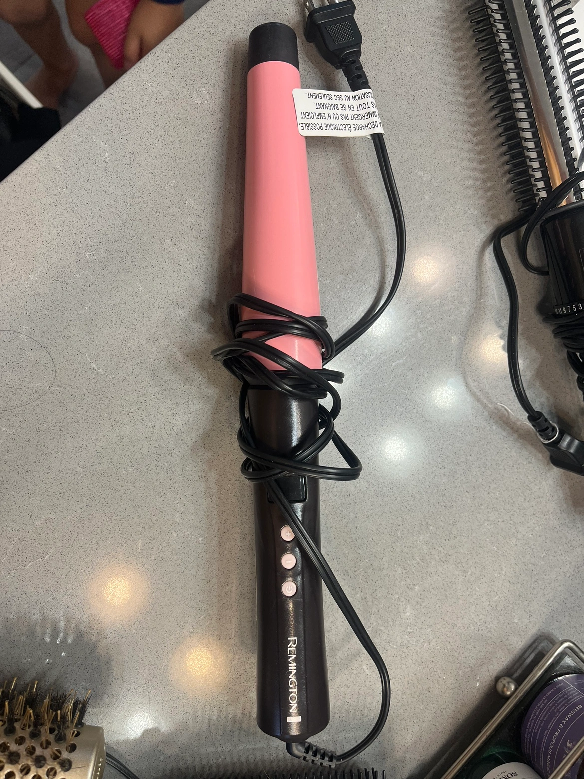 114Pink and black curling iron with a cord. The iron has multiple heat settings. Good for bouncy curls.