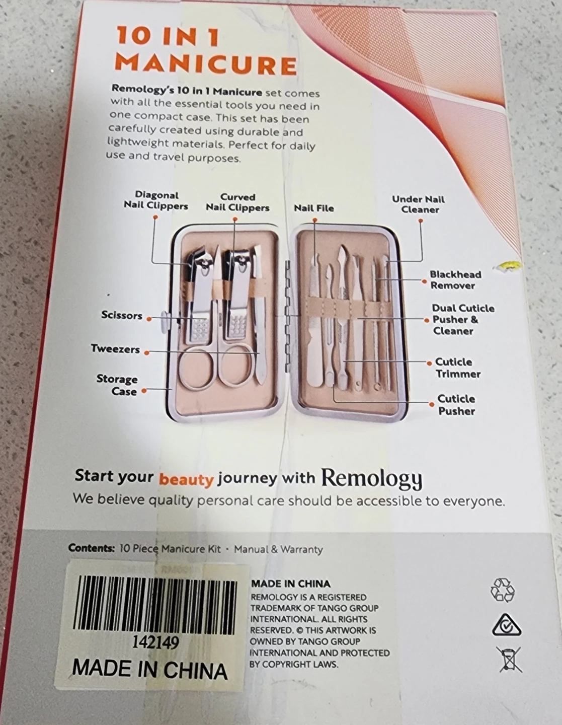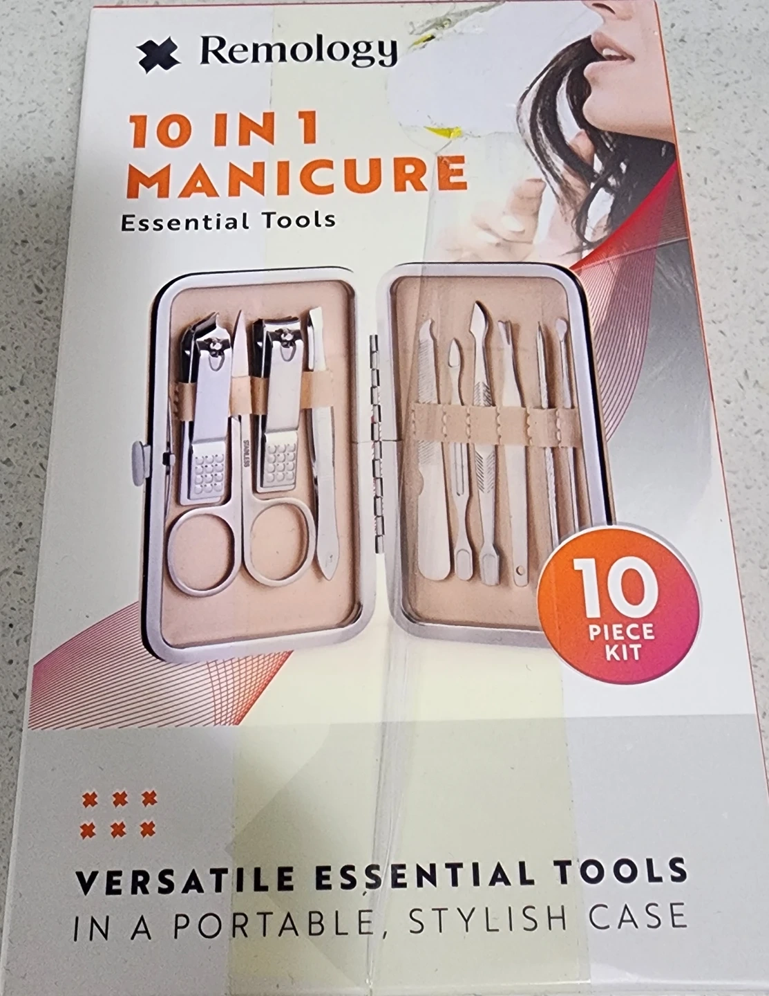 10This Remology 10 in 1 Manicure set comes with all the essential tools you need in one compact case! It's perfect for daily use and travel purposes. This set has been carefully created using durable and lightweight materials. It includes diagonal nail clippers, curved nail clippers, a nail file, under nail cleaner, blackhead remover, dual cuticle pusher & cleaner, cuticle trimmer, cuticle pusher, scissors, and tweezers. It also comes with a storage case!