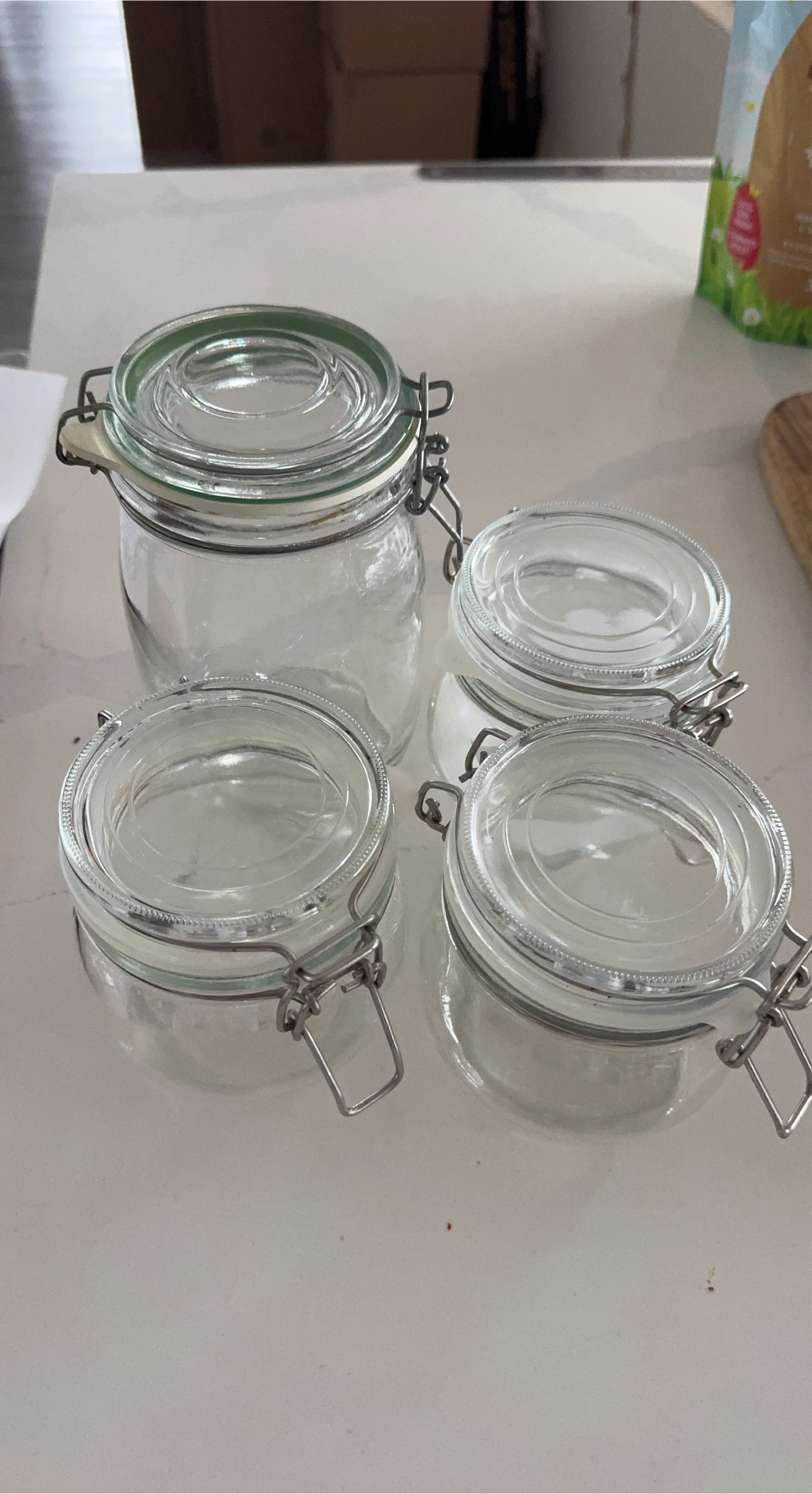 A set of four glass storage jars with airtight clamp lids. Clear glass construction is handy for seeing contents. Ideal for pantry staples or craft supplies!