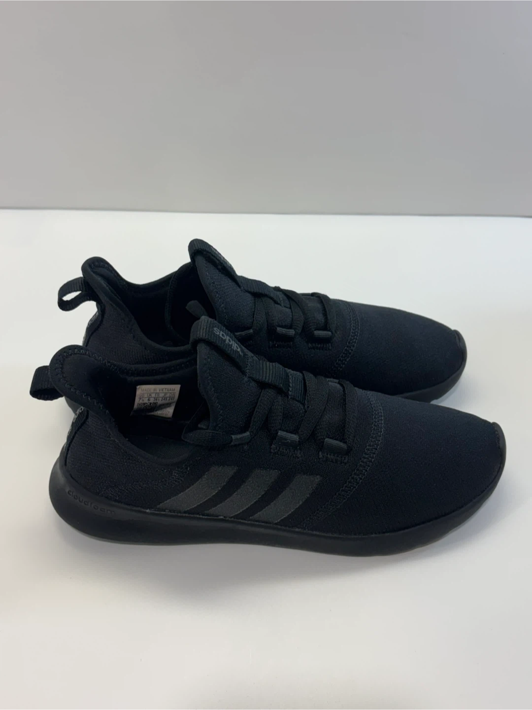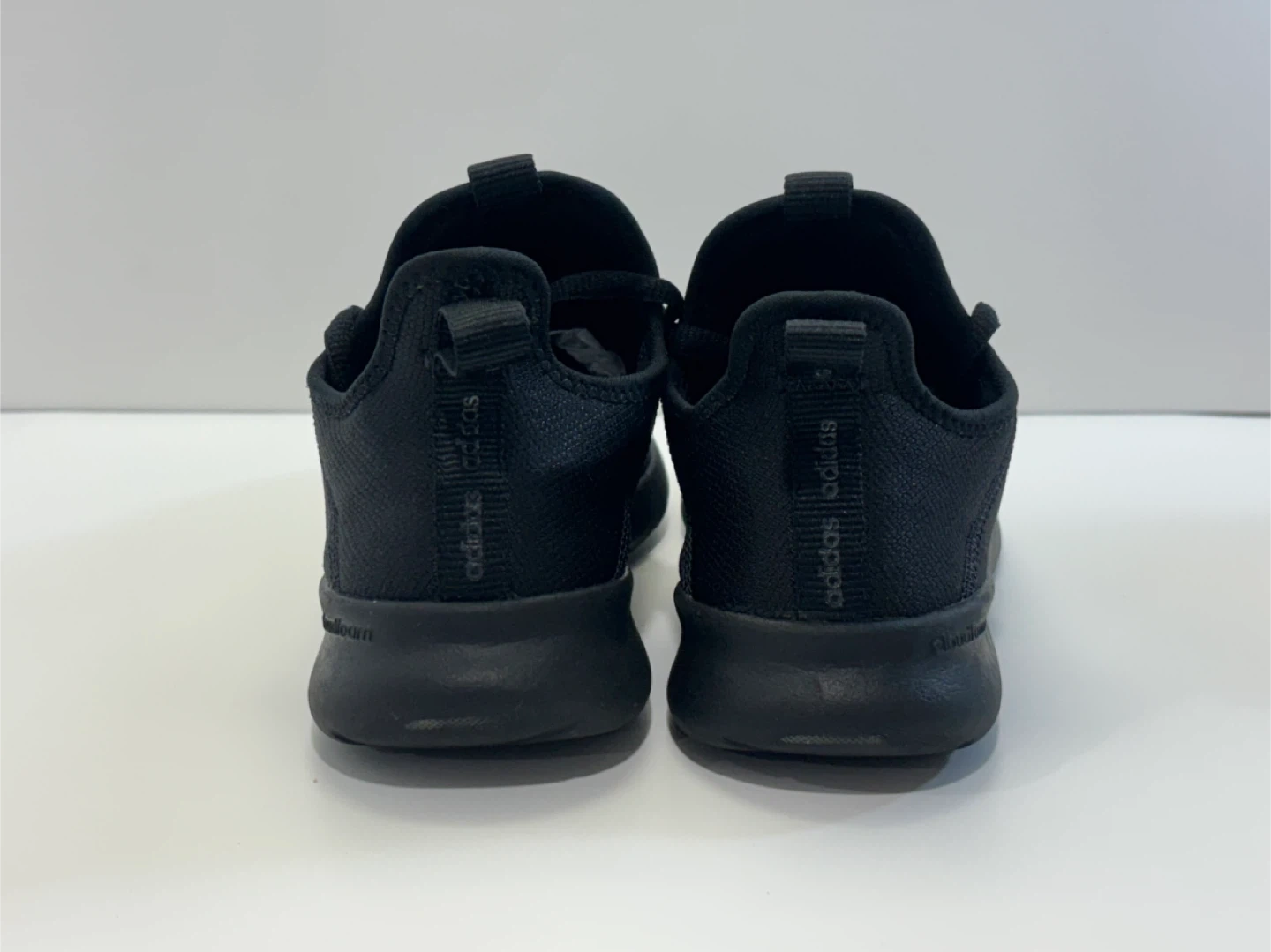These are a pair of black Adidas running shoes. They feature Cloudfoam cushioning for comfort. Perfect for everyday wear or light athletic activities.