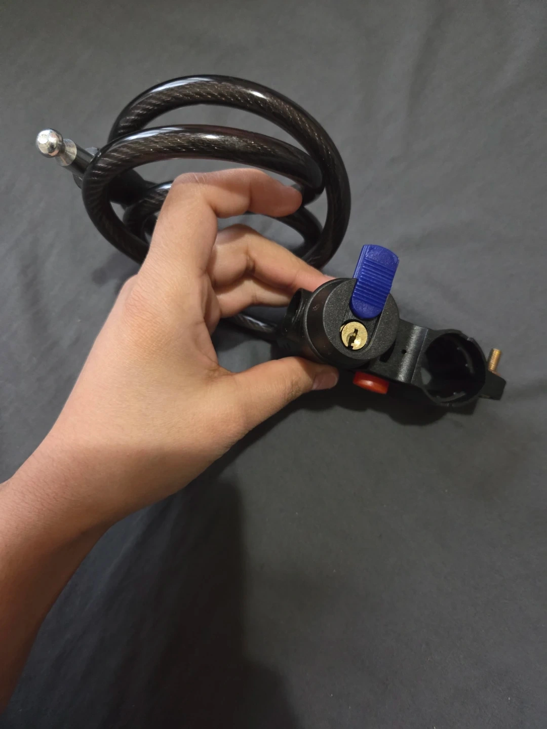 A black coiled bike lock with a plastic coating to prevent scratches. It comes with two keys for access and a mounting bracket to attach it to your bike frame. This lock helps secure your bike against theft.