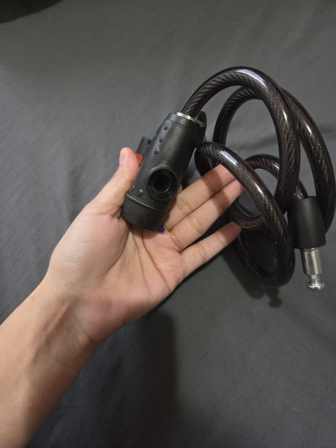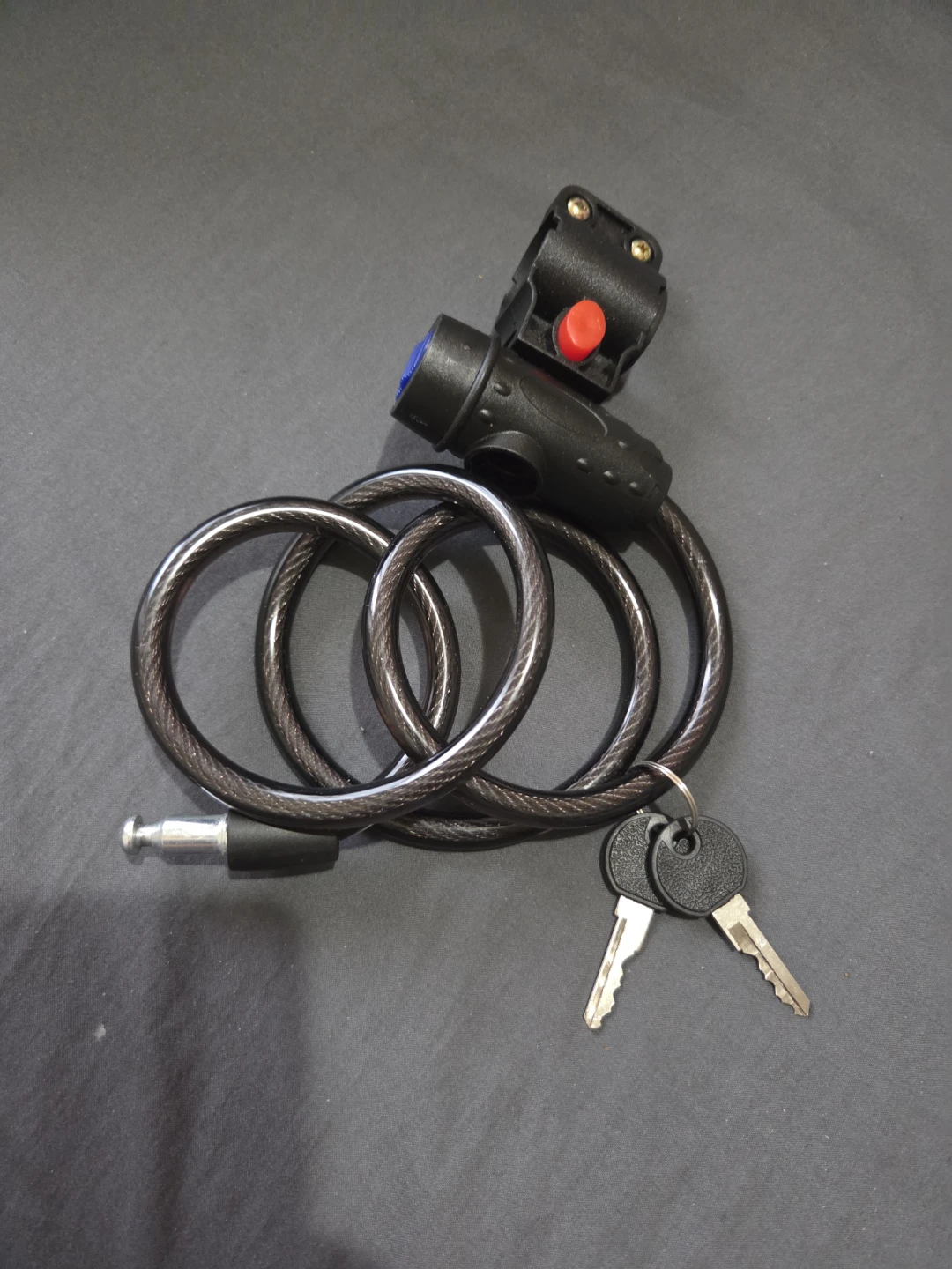 A black coiled bike lock with a plastic coating to prevent scratches. It comes with two keys for access and a mounting bracket to attach it to your bike frame. This lock helps secure your bike against theft.