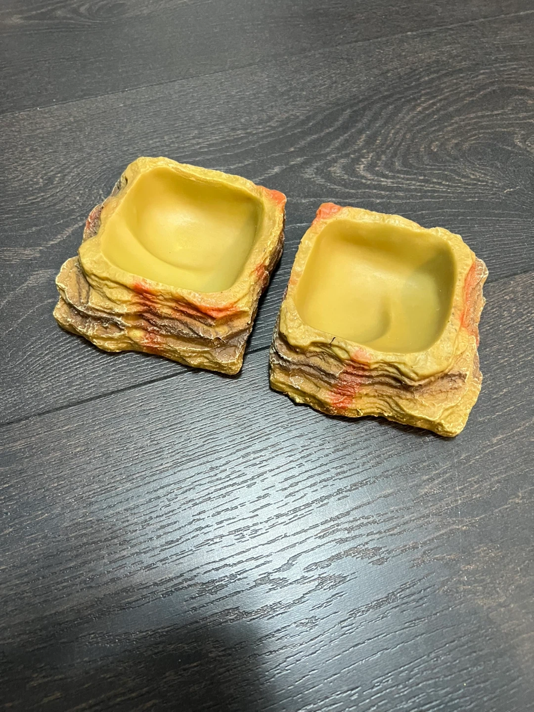 65Selling a set of two reptile food and water bowls. They have a natural rock-like appearance and a smooth interior for easy cleaning. Perfect for small to medium-sized reptiles!