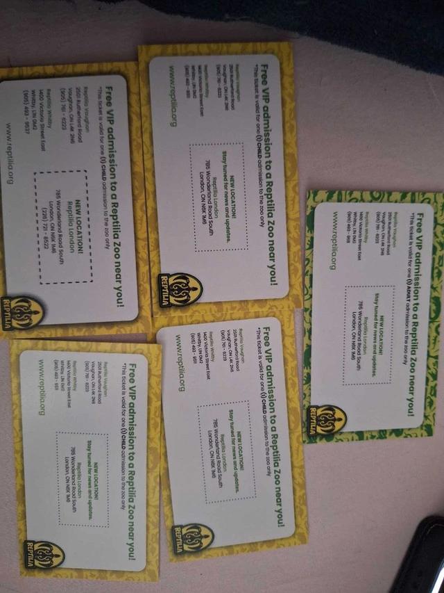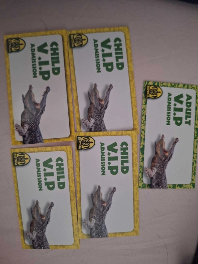 Get ready to slither into savings with these Reptilia VIP tickets! I have 4 child VIP tickets and 1 adult VIP ticket available for your next reptilian adventure. These tickets offer a special experience at Reptilia Zoo, making your visit even more memorable. $68 value but only asking $45 * 4 Child VIP Admission Tickets * 1 Adult VIP Admission Ticket Unleash your inner explorer, because with these tickets, you're not just visiting a zoo; you're embarking on a reptilian quest! Please note: If the ad's still up, the tickets are still available!