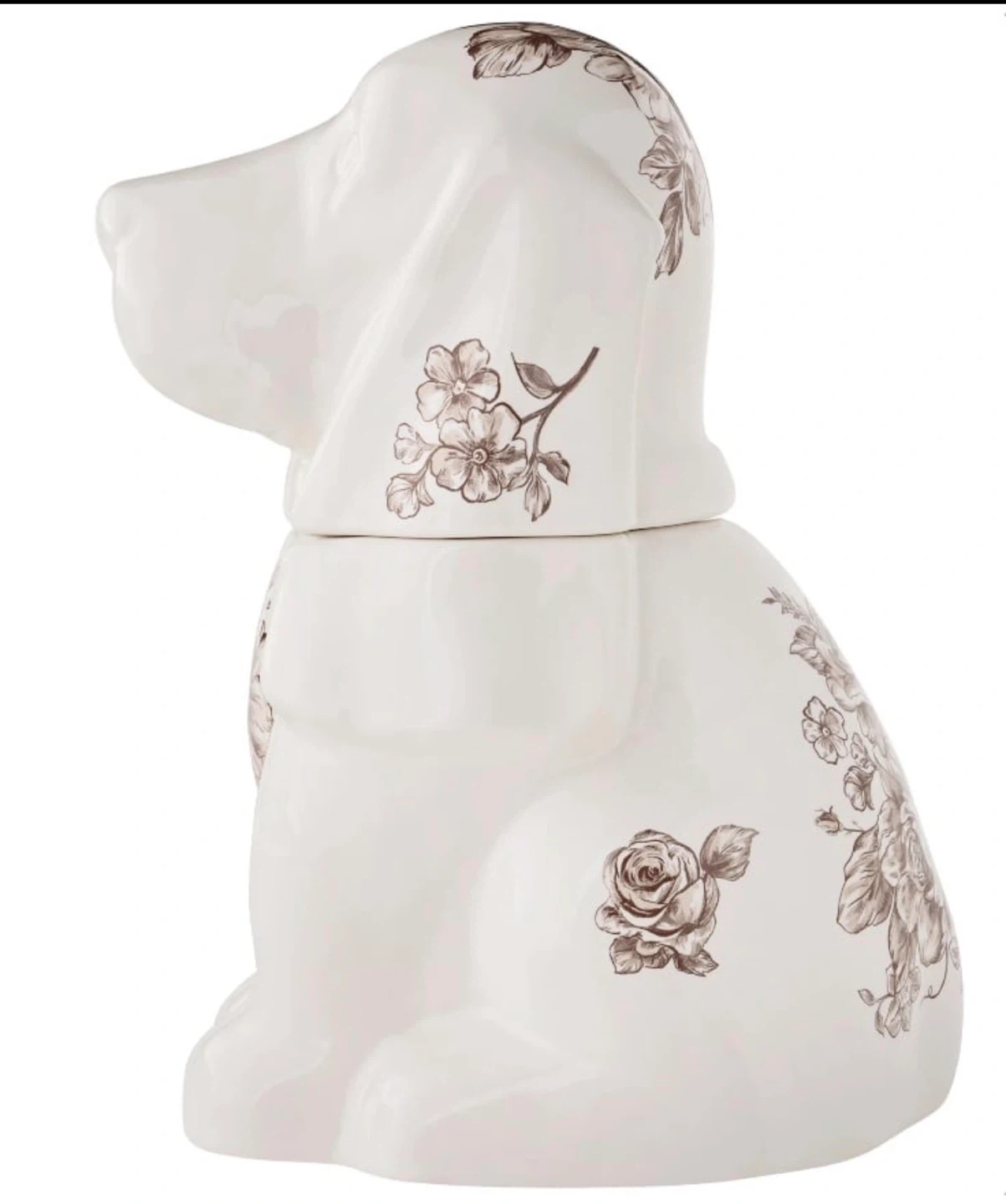 This ceramic jar is shaped like a cute dog and features a lovely brown floral pattern. It's perfect for storing cookies or other small treats. The lid fits securely on top.