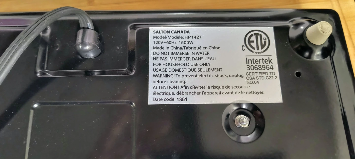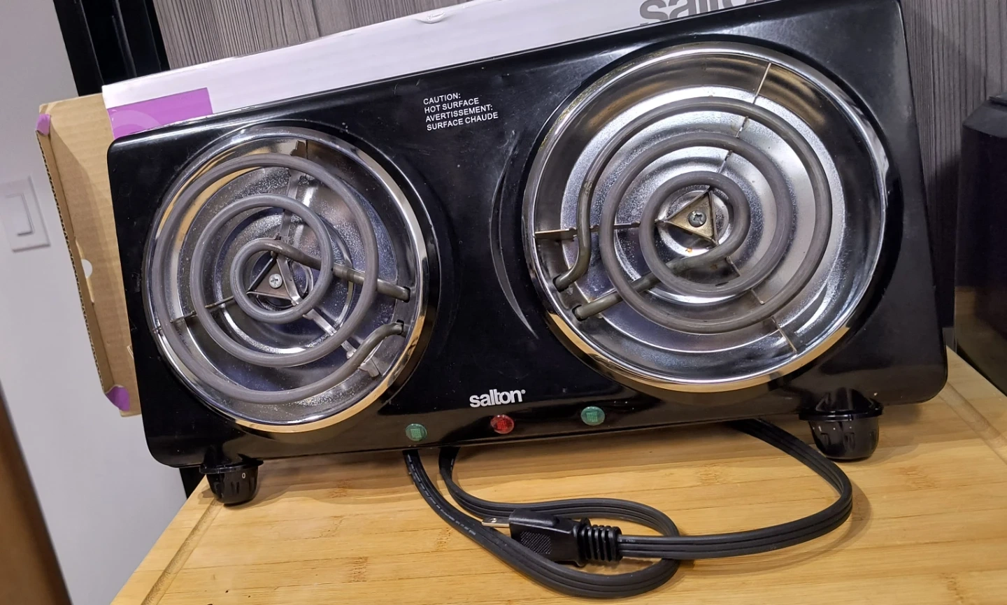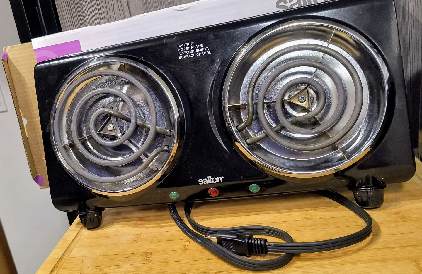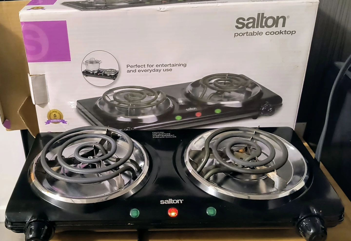 This is a Salton portable double burner cooktop, model HP 1427. It features high speed coil elements and variable temperature controls. It's perfect for entertaining and everyday use, ideal for cottages, student dorms, or camping.