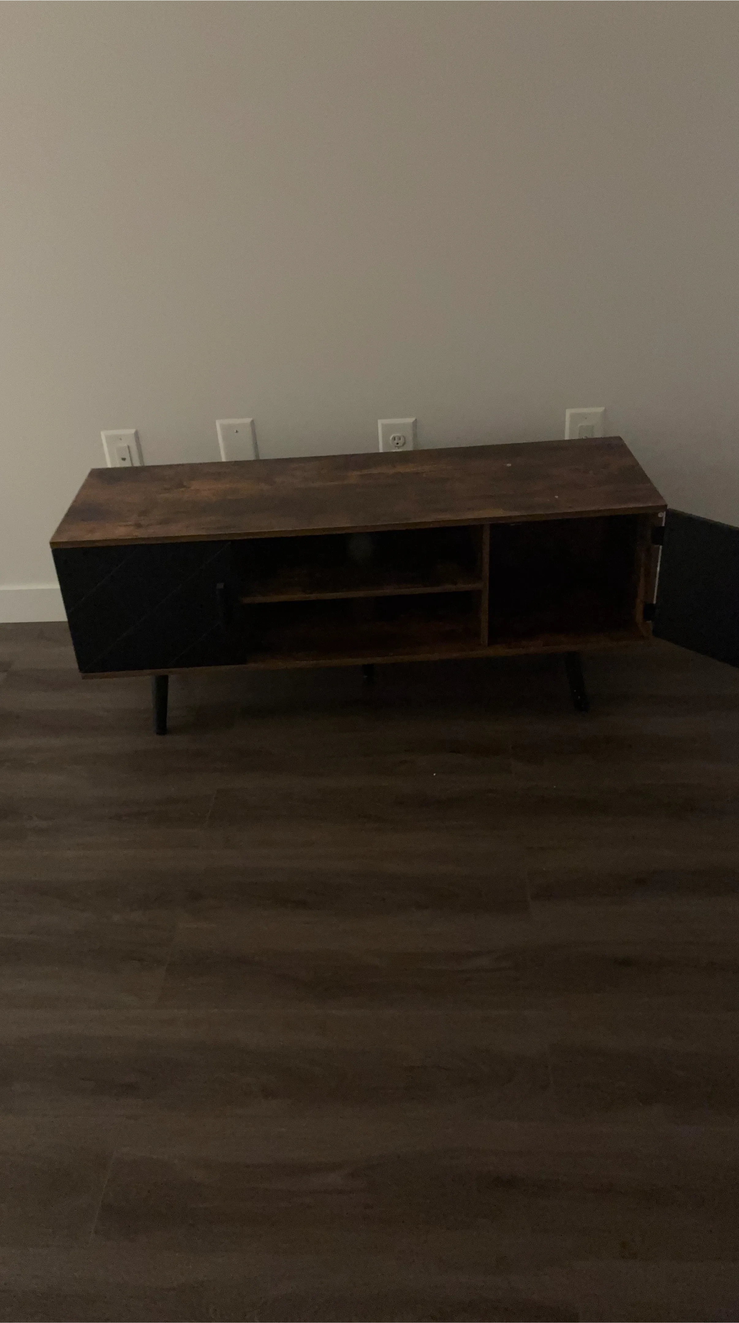 Selling a brown TV stand/entertainment center. It has a dark brown wood-look top and a black cabinet door with a geometric design. It features open shelving for media components and storage. Great for any living room!