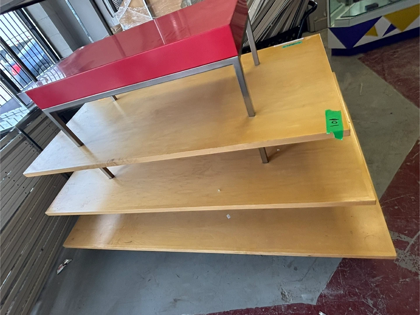 60Selling a retail display shelving unit, perfect for showcasing items in a store or at a market. It features three shelves, providing ample space for your products. The top display area is red, adding a pop of colour to your setup. This unit is sturdy and ready to use!