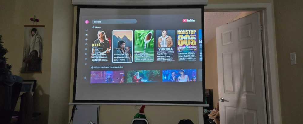 60A retractable projector screen. The screen is mounted to the wall, above other items. It seems ideal to watch movies in the comfort of your own home.