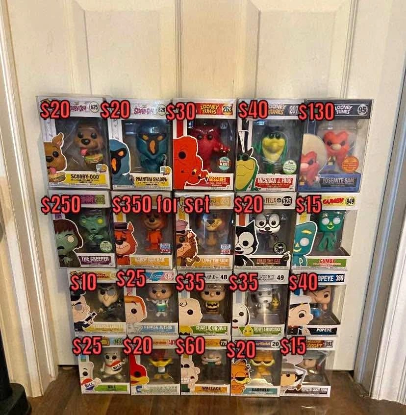 10Not all boxes are mint, so feel free to ask for more pictures! Prices: - Scooby Doo #625: $20 - Scooby Doo Phantom Shadow #629: $20 - Scooby Doo Creeper 2017 Spring Convention Exclusive #203: $250 - Looney Tunes Gossamer #263: $30 - Looney Tunes Michigan J Frog 2017 Spring Convention Exclusive #207: $40 - Looney Tunes Yosemite Sam NFT (1635 Pieces): $130 - Lippy The Lion & Hardy Har Har Set (1000 Pieces Each): $350 - Felix the Cat Pop Cultcha Exclusive #525: $20 - Gumby #949: $15 - Rocky & Bullwinkle Fearless Leader #451: $10 - Jetsons George Jetson #365: $25 - Peanuts Charlie Brown #48: $35 - Peanuts Snoopy & Woodstock #49: $35 - Popeye #369: $40 - Schoolhouse Rock #1417: Bill $25 - Woody Woodpecker #487: $20 - Wallace and Gromit Wallace #775: $60 - Garfield #20: $20 - Inspector Gadget #893: $15