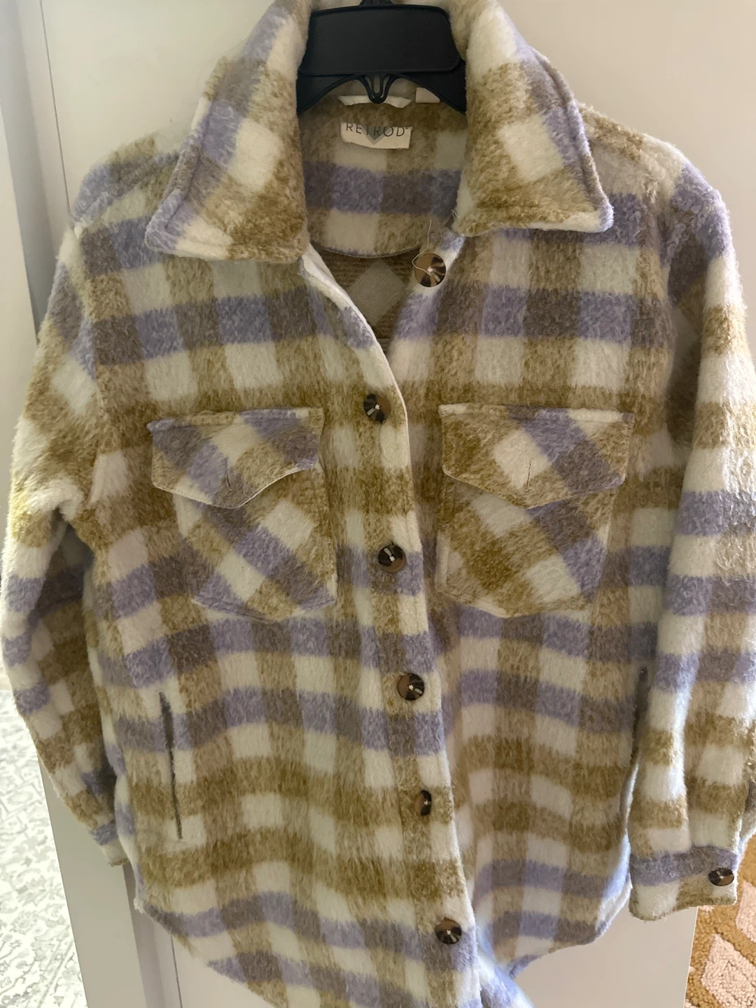 39Cozy RETROD plaid shacket with a button-up front and chest pockets! Perfect for layering on chilly days