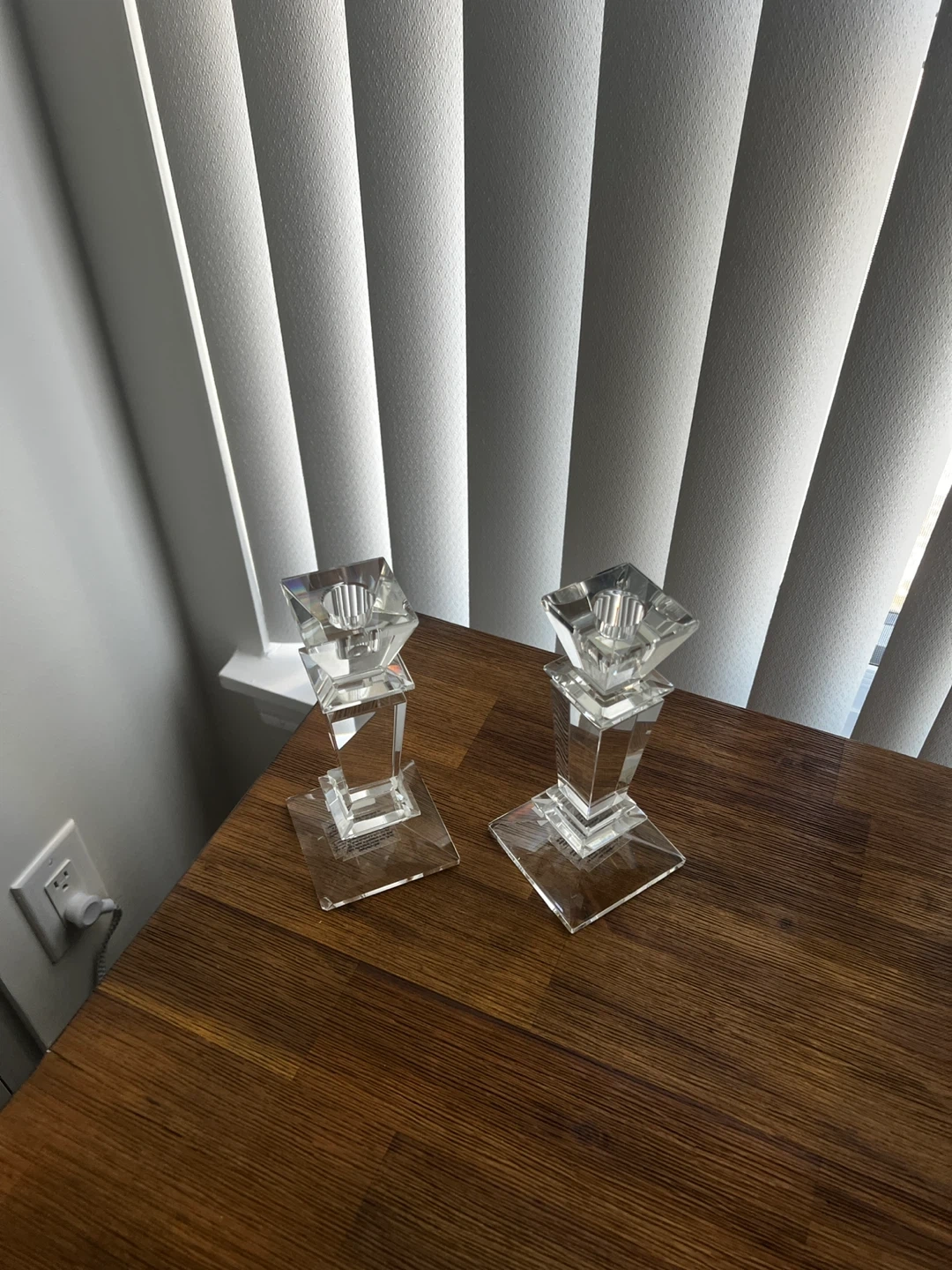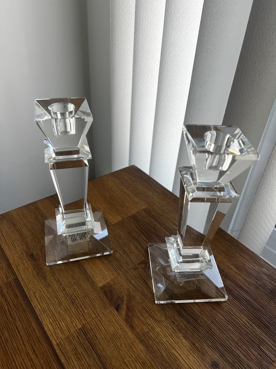 A pair of elegant crystal candlesticks. These pieces have a modern geometric design, perfect for adding a touch of sparkle to any room. Clear glass material.