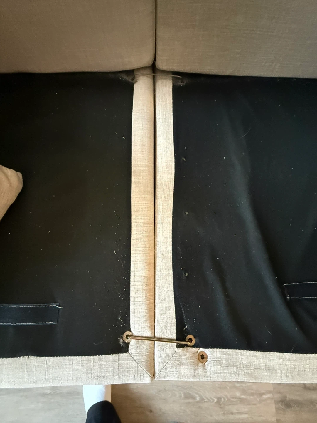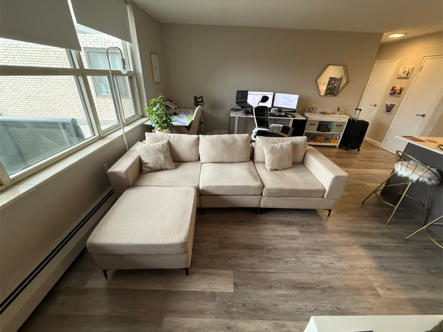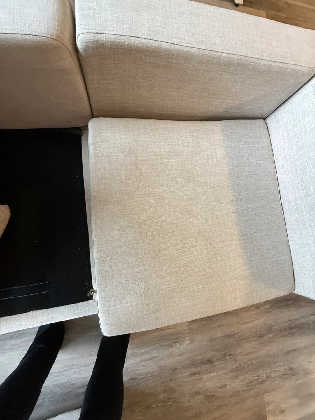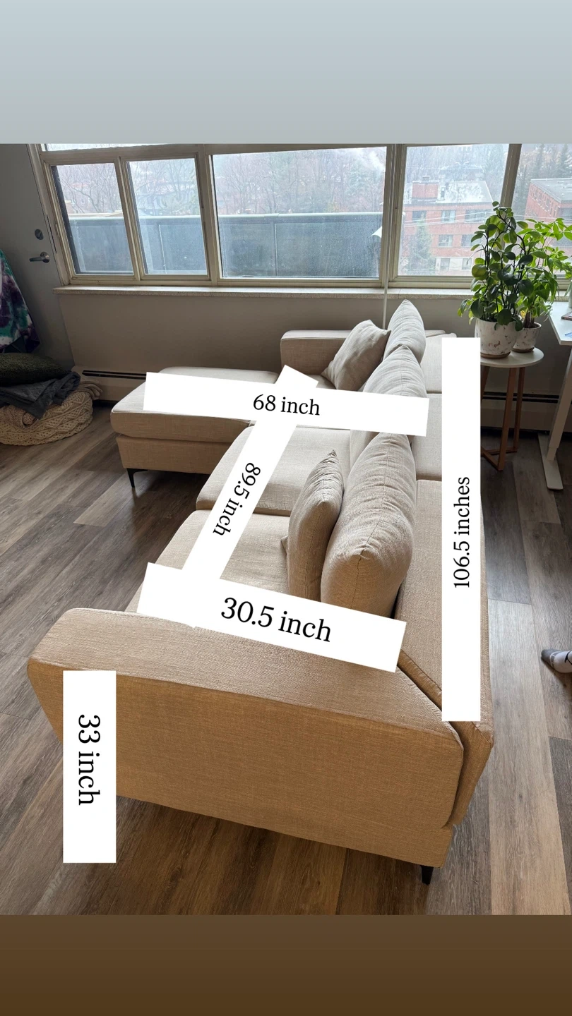 Purchased brand new roughly two years ago. We use it daily so there are a few marks and general use signs. The three piece clicks together with hooks. However one hook hole was misplaced when we bought it so we got our own rod and made a makeshift hook to keep it all together (shown in photos). The 4th piece can be used as a chaise in either side of couch or as an ottoman. Velcro under pillows to secure in place. Couch comes with 2 matching throw pillows. One piece sits back a little further than the others (shown in photos) but that may be able to be fixed with some tightening. Beige in colour.