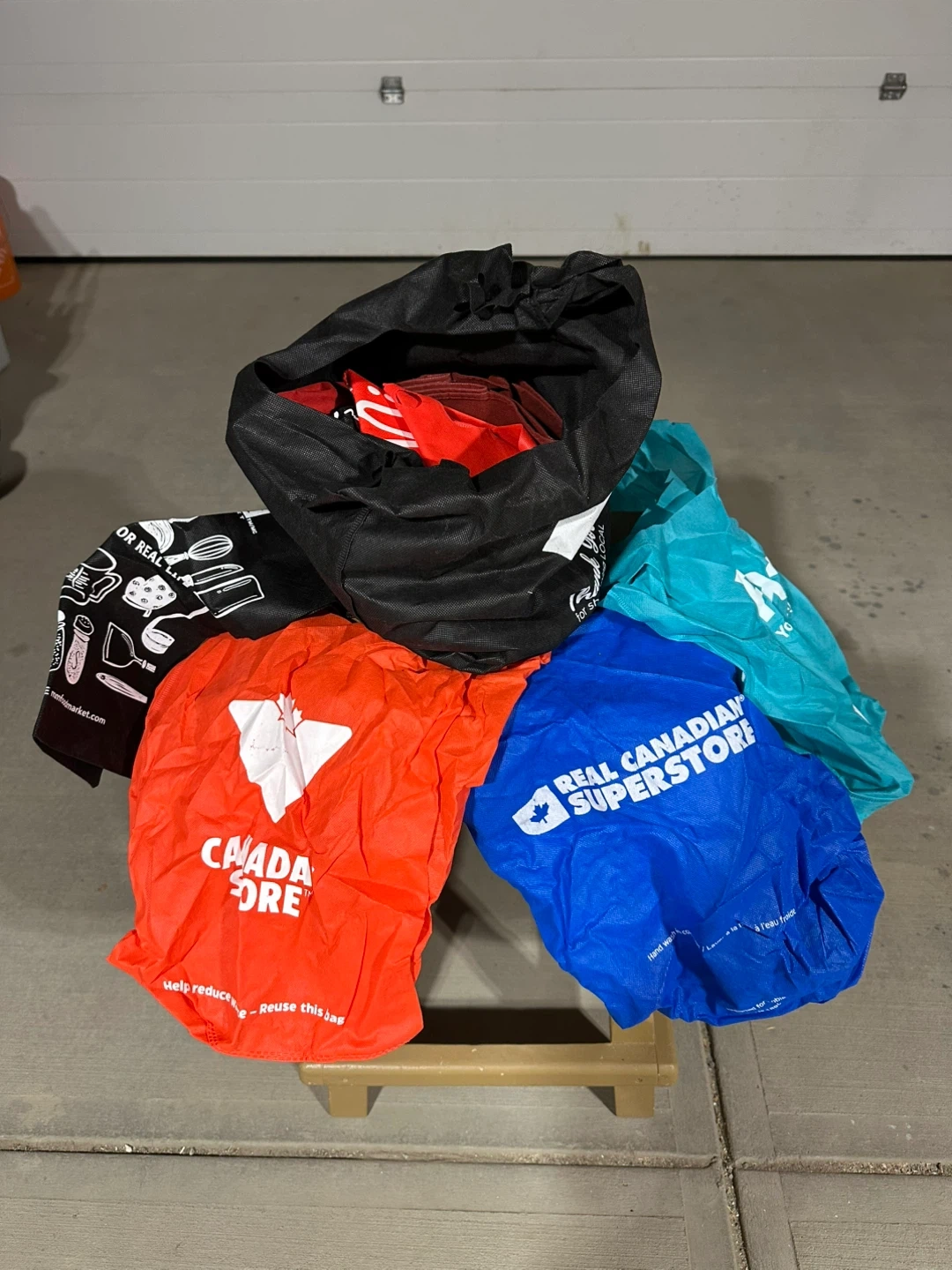 43Free collection of reusable shopping bags from Canadian stores. Includes bags from Canada Store and Real Canadian Superstore. Great for groceries and reducing plastic waste! 12 bags WSPU no holds