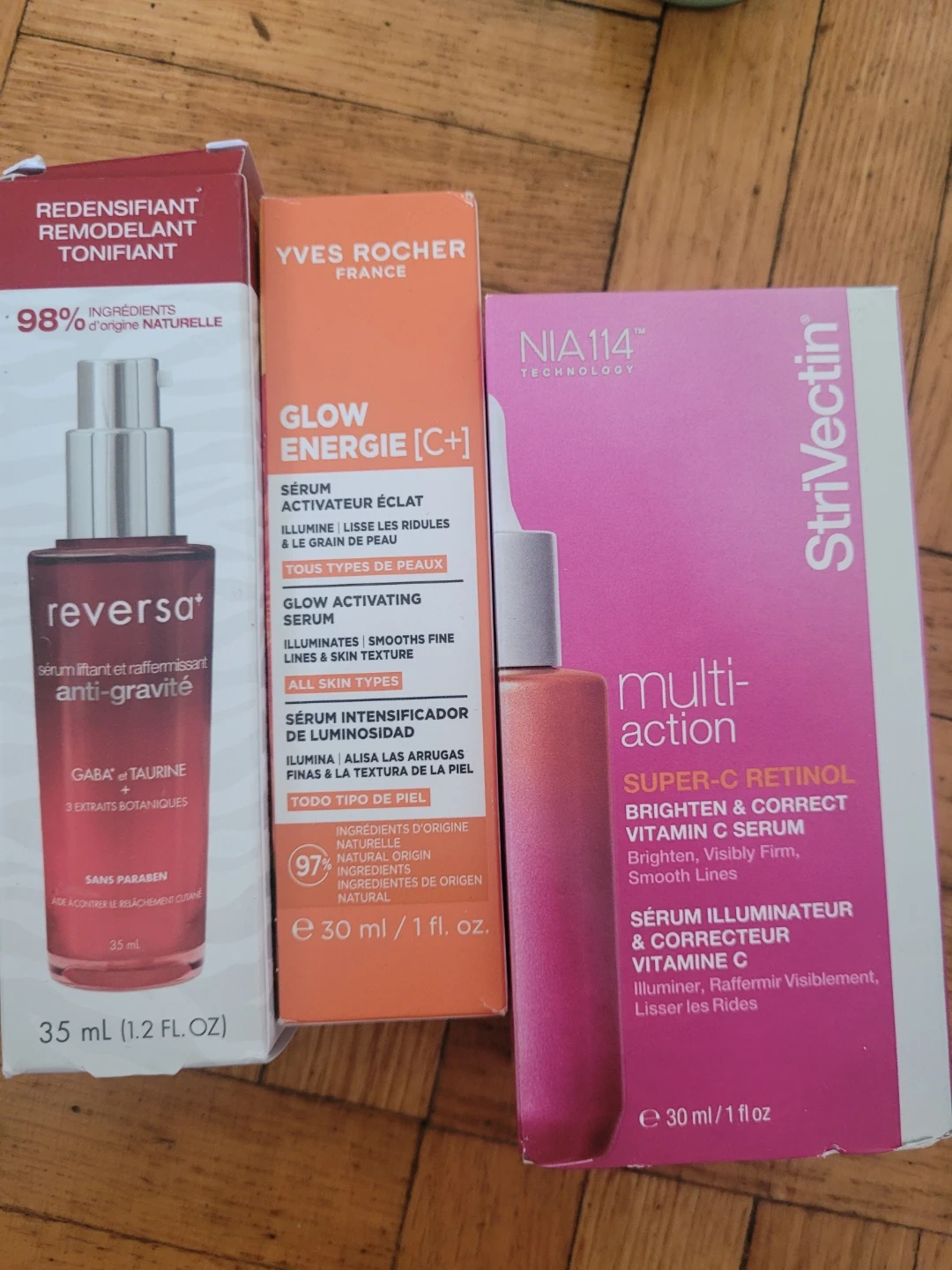 34Selling a set of three serums: Reversa anti-gravity serum (35 ml), Yves Rocher Glow Energie [C+] serum (30 ml), and StriVectin multi-action Super-C Retinol Vitamin C serum (30 ml)