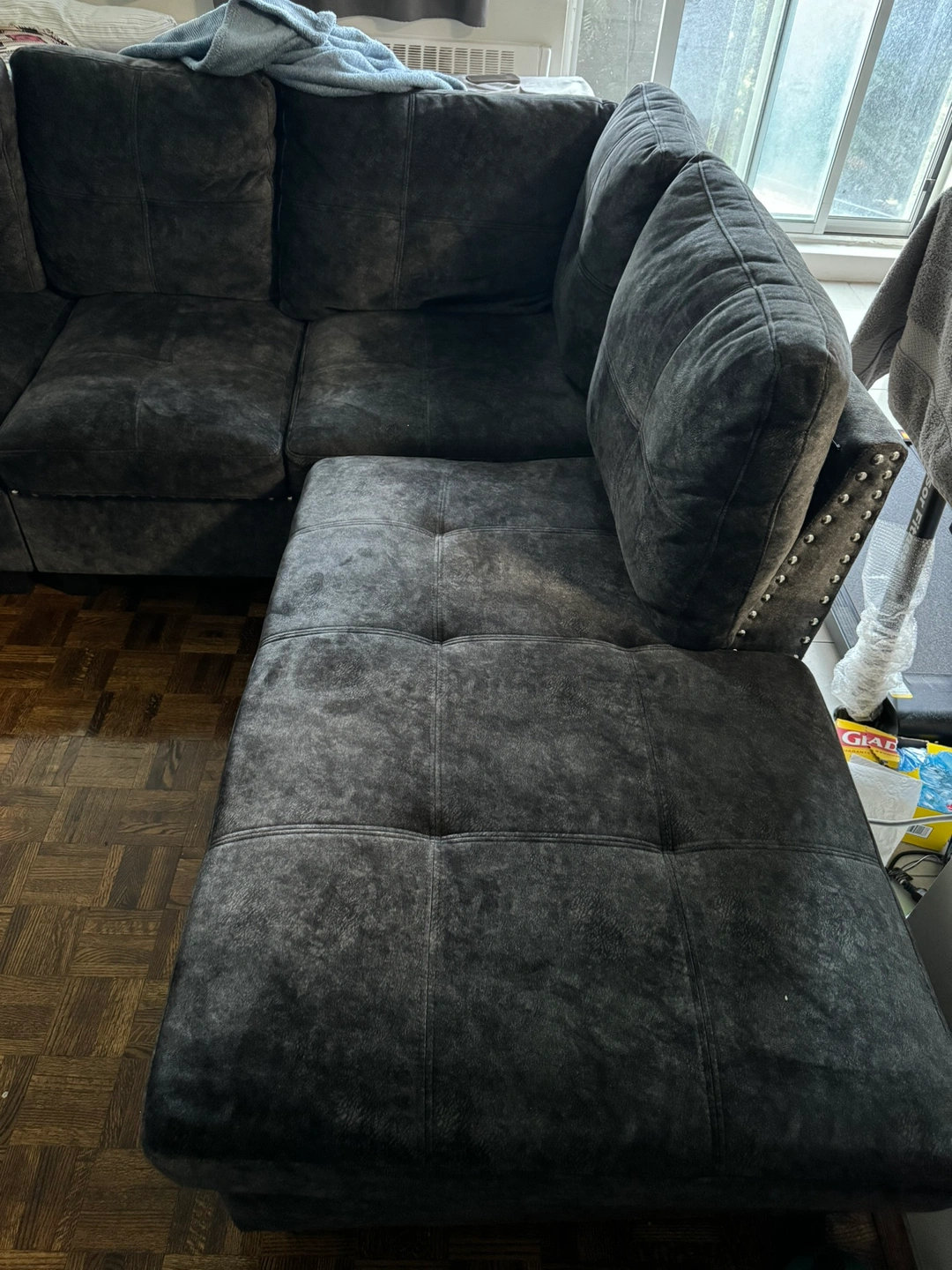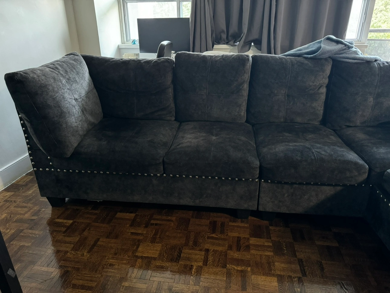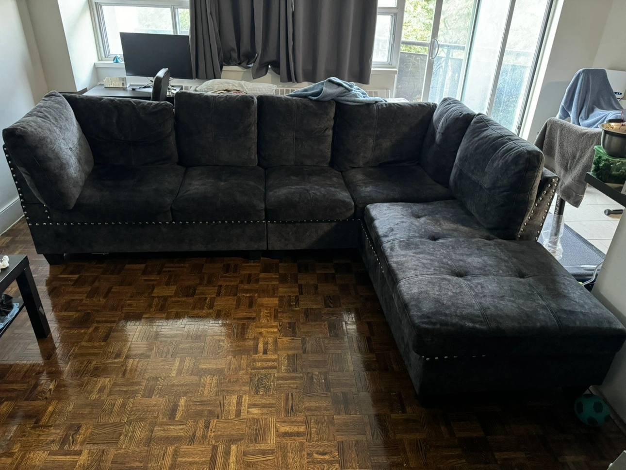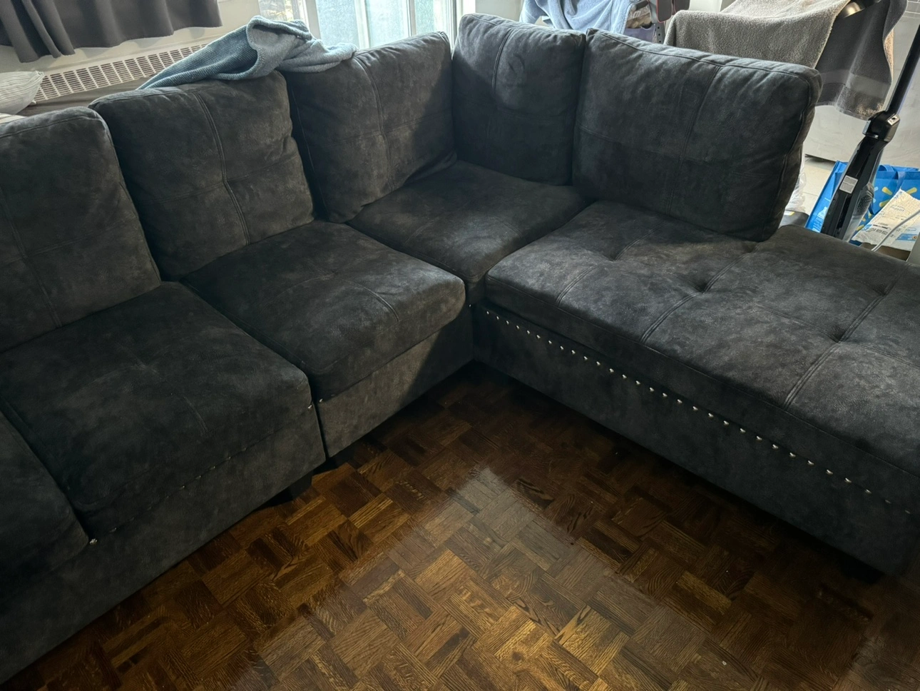 20Large grey sectional sofa with tufted cushions. All covers are zippered, can be removed and washed in the machine(cold wash only). Used by a couple. No scratches and no tears. Sturdy & firm seats, with comfortable form. Reversible chase. Sofa splits in 3 pieces making it’s easy to move. Needs 2 people to move it by hand. I can help if you come alone. RFS: Moving out sale Delivery: Pick-Up Only @Wellesley & Church Payment: eTransfer or Cash Smoke-free, pet-free, and child-free home