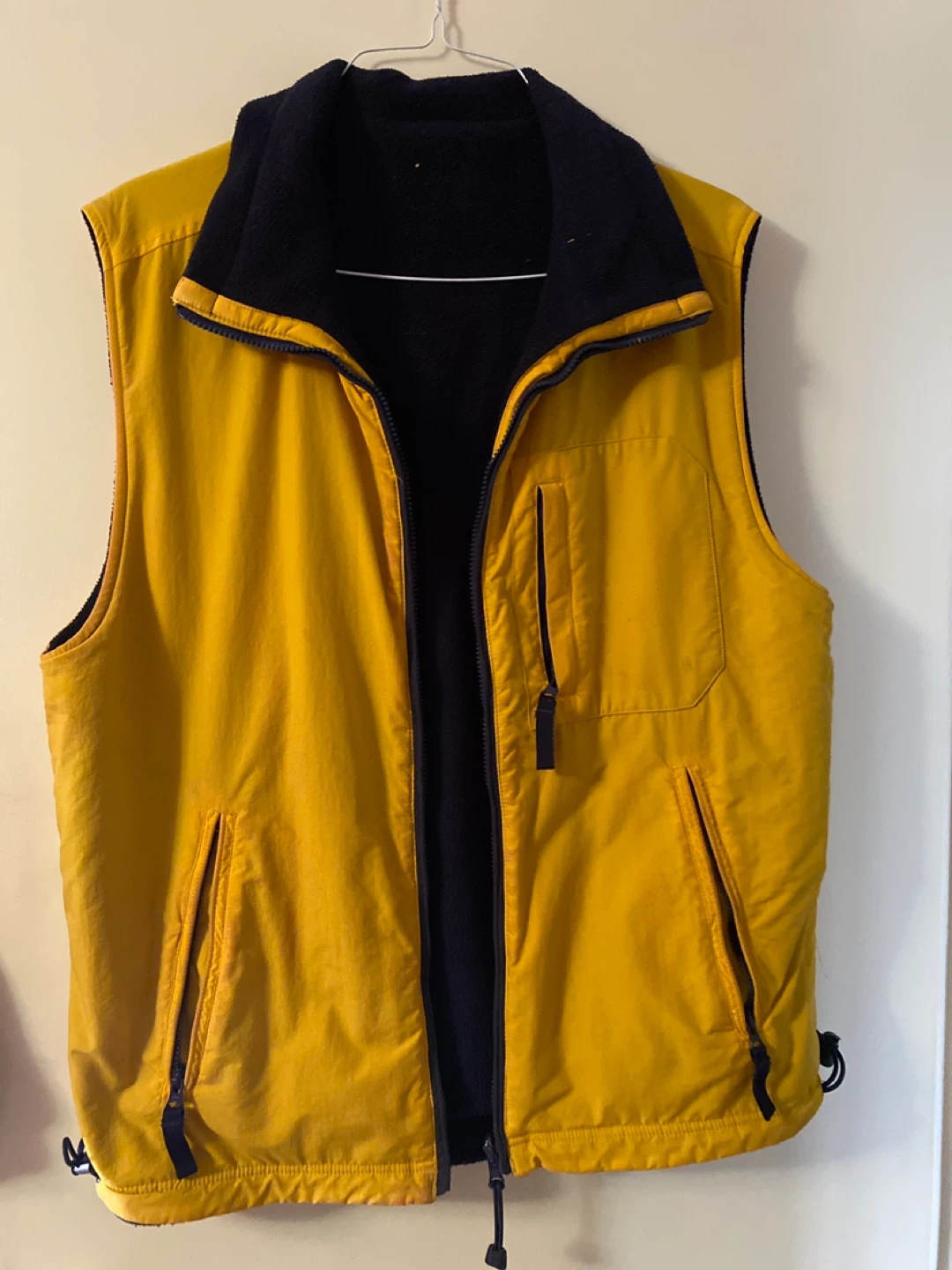 25This reversible vest is in great condition! One side is a bright yellow and the other is navy blue fleece. It's perfect for layering on those chilly days!