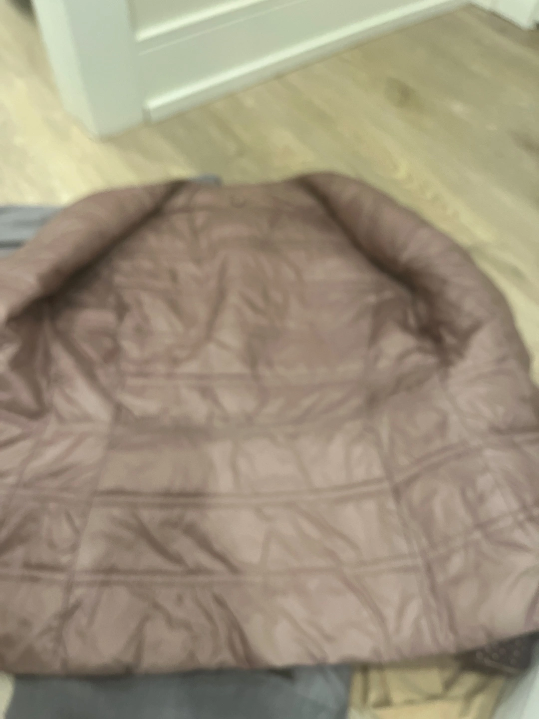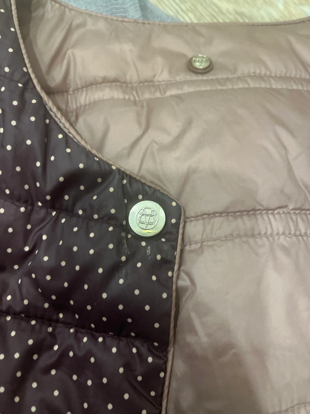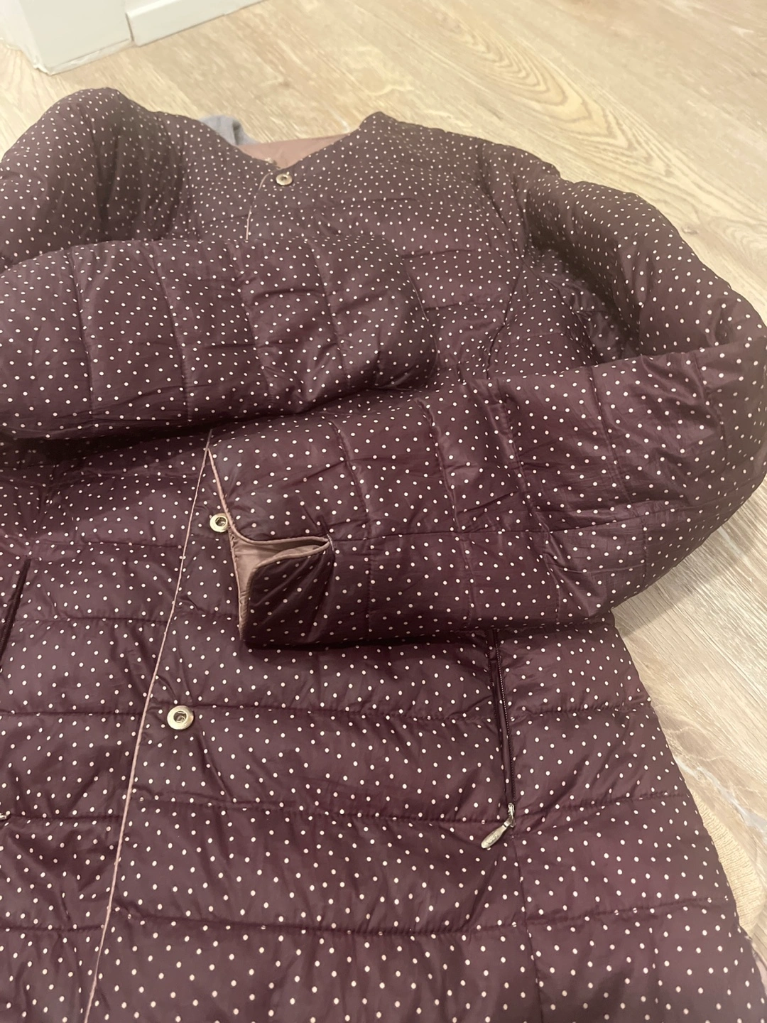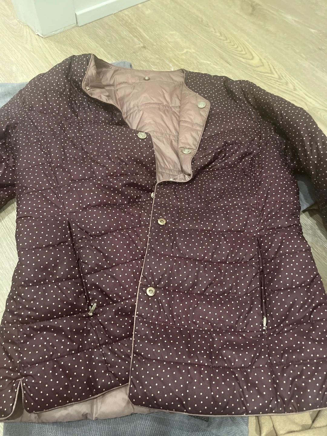 Here's a reversible padded jacket in great condition. One side features a brown polka dot pattern, and the other side is a solid taupe colour. It's lightweight and perfect for layering!