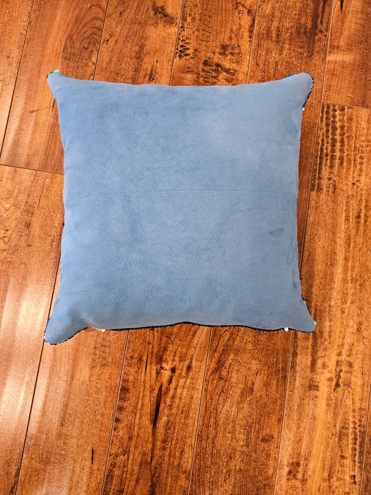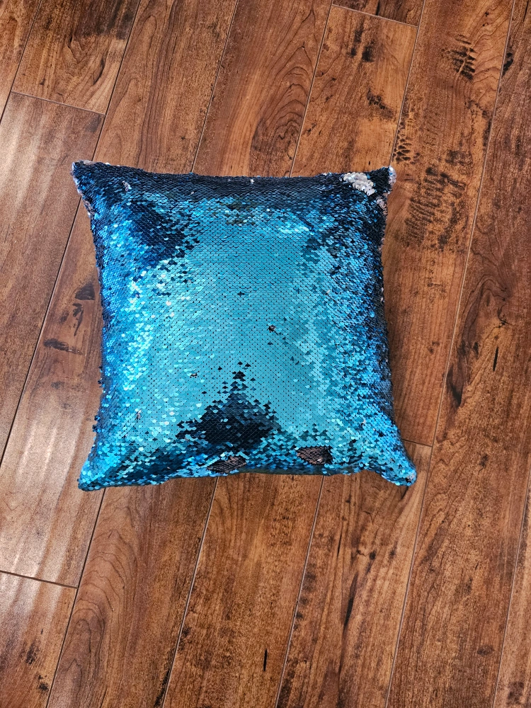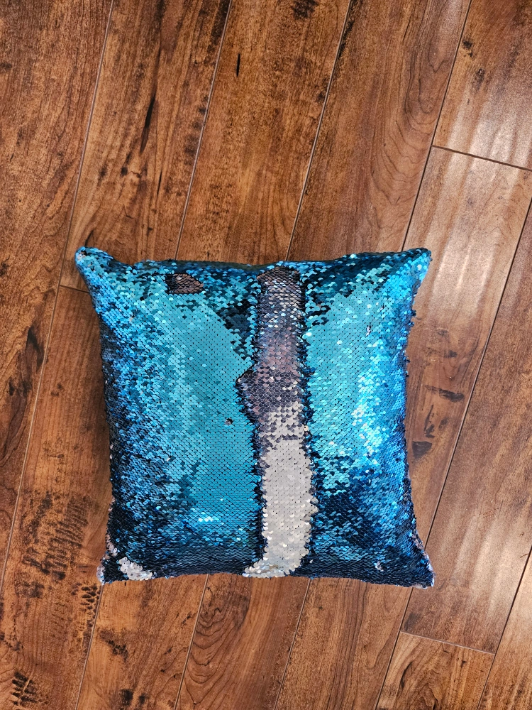 36Square sequin pillow. Reversible. Teal and grey sequins. Soft, plush backing. Great for adding a touch of sparkle to your space.