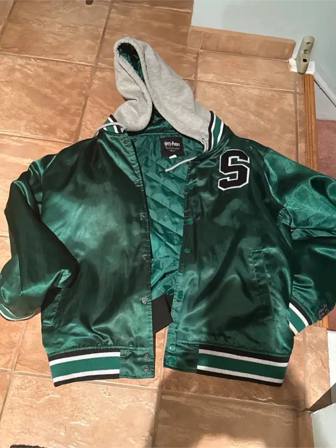 Selling a Harry Potter Slytherin jacket in size XL! It's a stylish green satin jacket with a grey hood and the Slytherin logo on the back. Perfect for any Harry Potter fan!
