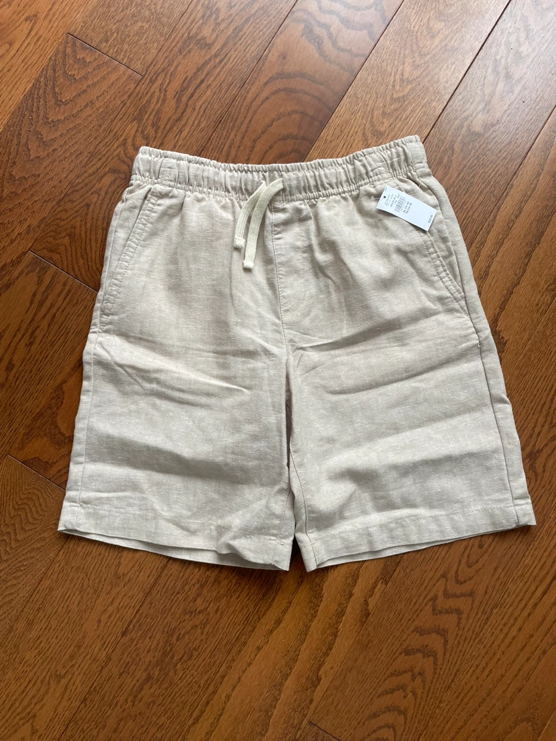 These beige Old Navy shorts are a size XL (14-16). They're made with a linen blend fabric for comfort. The waistband is elastic with a drawstring, and they have a relaxed fit.