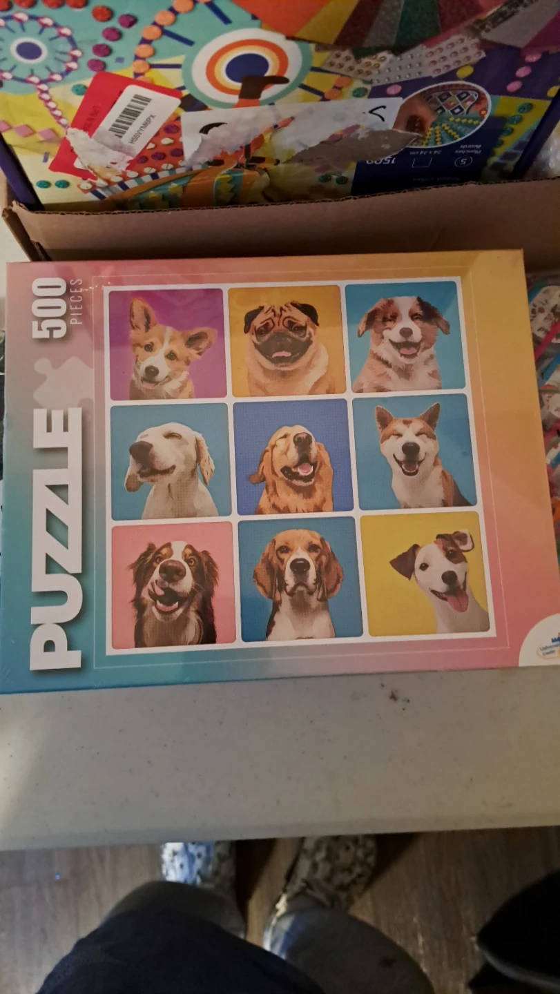 This is a brand new in box 500-piece puzzle featuring a collage of nine different dogs. The puzzle is suitable for ages 12 and up. It's a great way to pass the time!