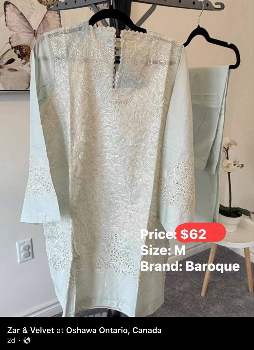 This Baroque kurti is a light blue colour and comes in size medium. It features intricate white embroidery all over the fabric, including on the sleeves and hem. Perfect for formal or casual wear!