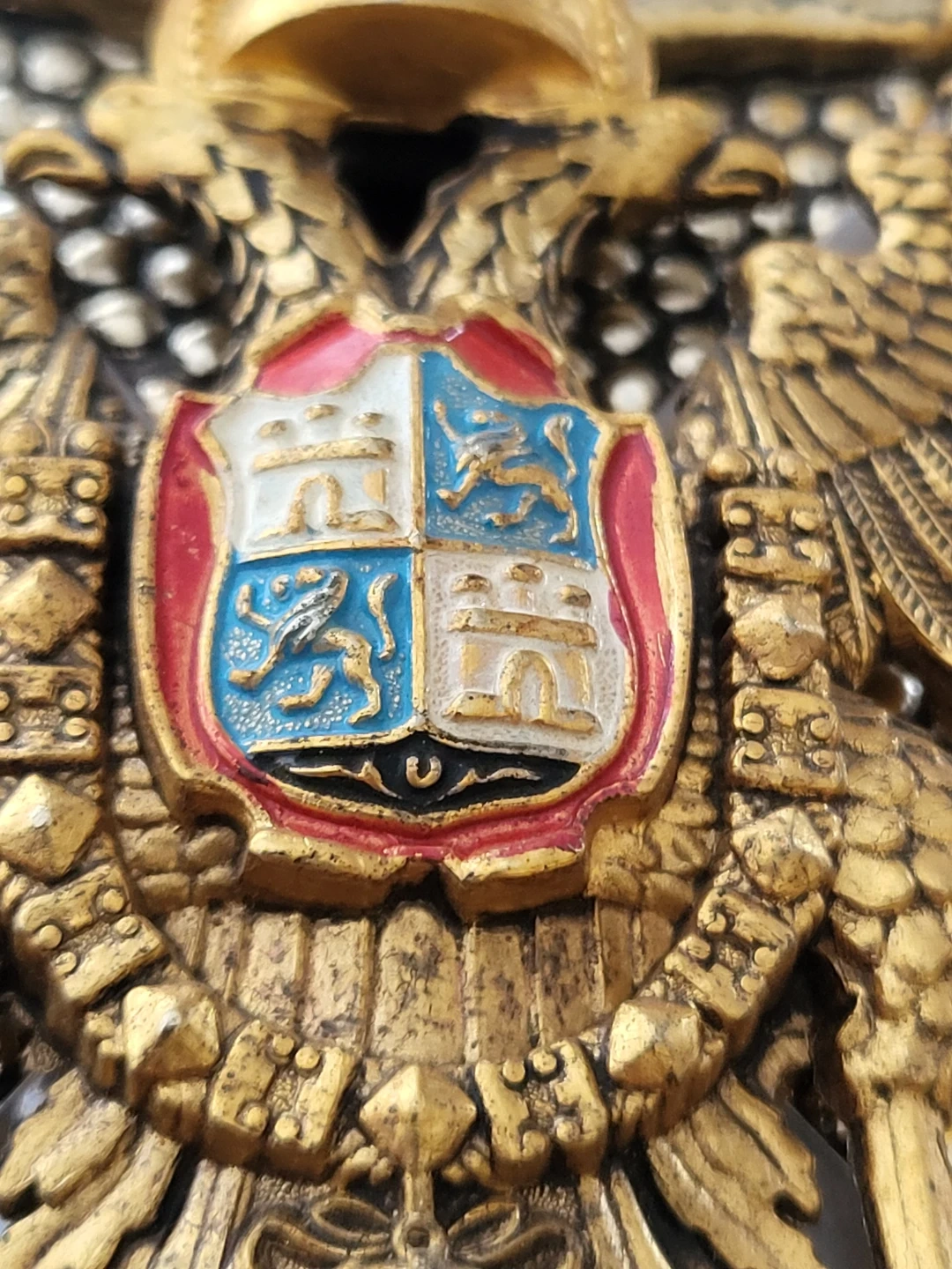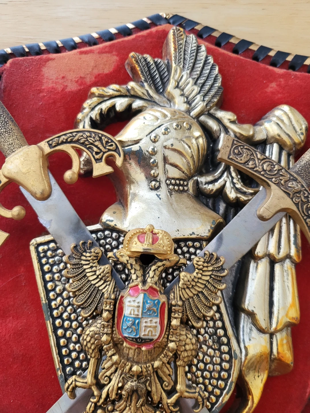 This decorative wall plaque features a knight's helmet and crest on a red shield, embellished with two crossed swords. It's a striking piece with intricate golden detailing and a regal motif. This would look great as a statement piece in a study or living room!