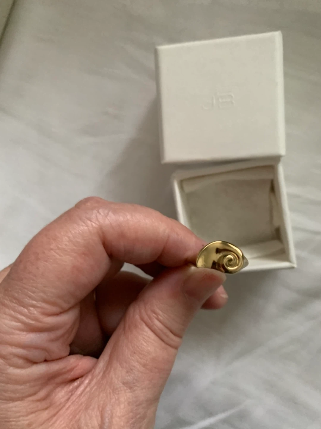 This stylish gold-tone ring features a unique swirl design. It's presented in a small white jewellery box, perfect for safekeeping or gifting. A lovely accessory to add to any collection! Water proof.