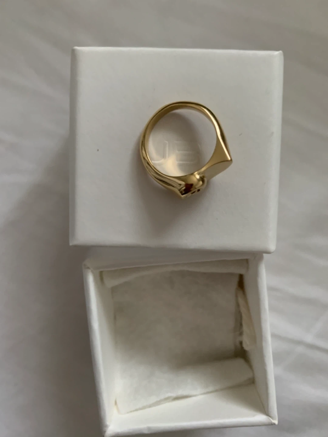 This stylish gold-tone ring features a unique swirl design. It's presented in a small white jewellery box, perfect for safekeeping or gifting. A lovely accessory to add to any collection! Water proof.