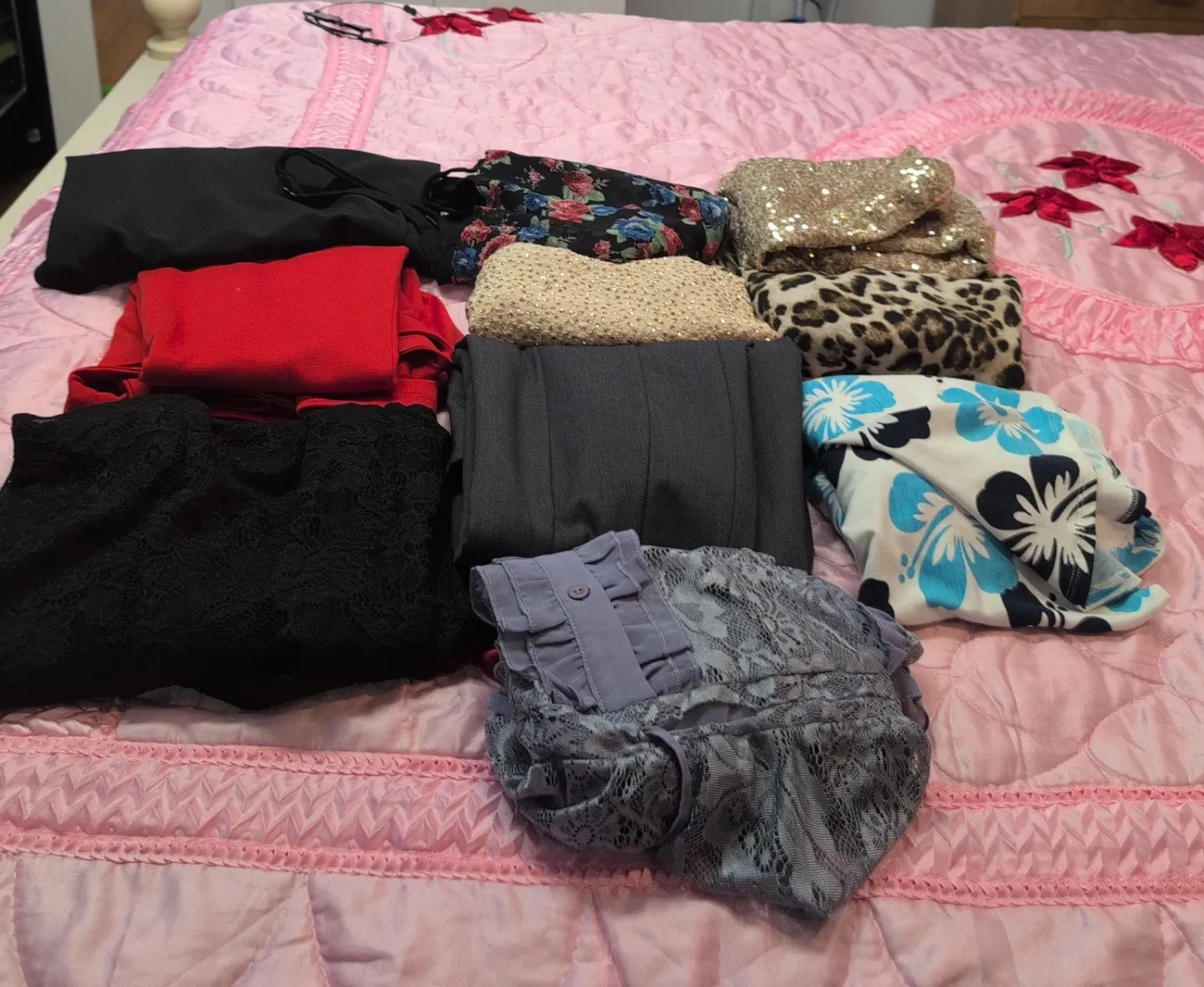 Bundle of assorted women's clothing items. Includes tops and other apparel in various colours and patterns. Fabrics include lace and sequin.