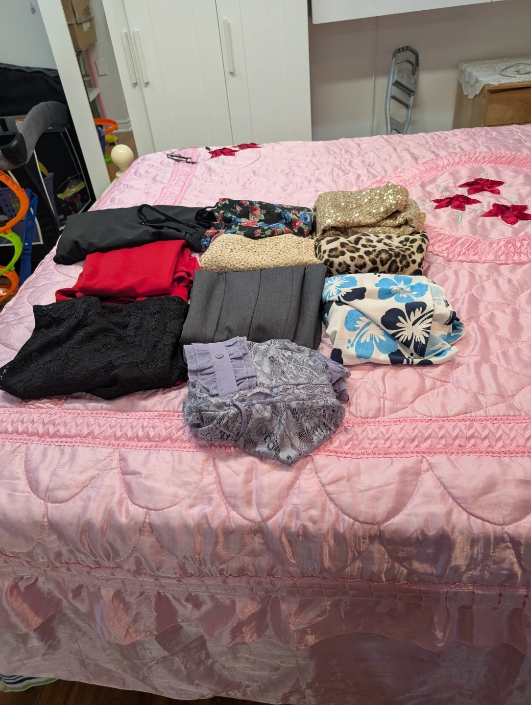 Bundle of assorted women's clothing items. Includes tops and other apparel in various colours and patterns. Fabrics include lace and sequin.