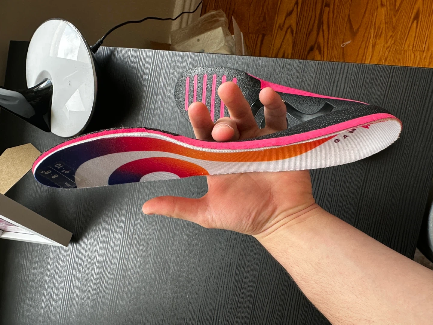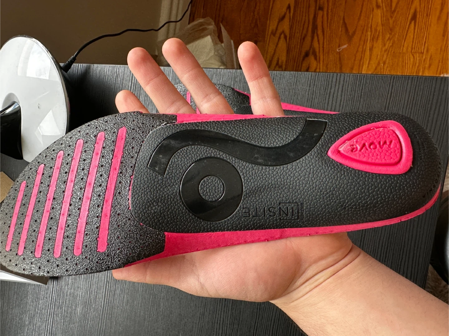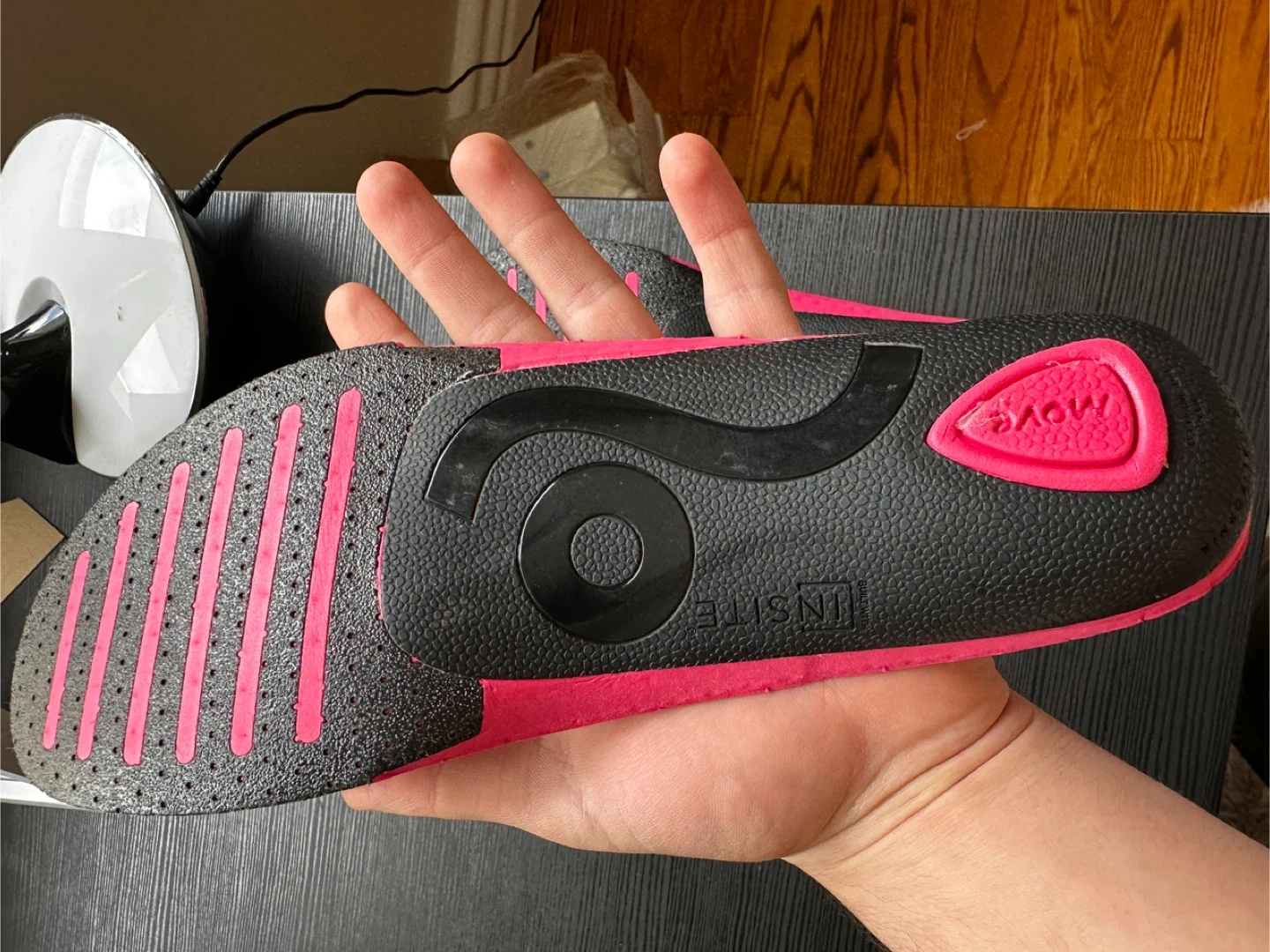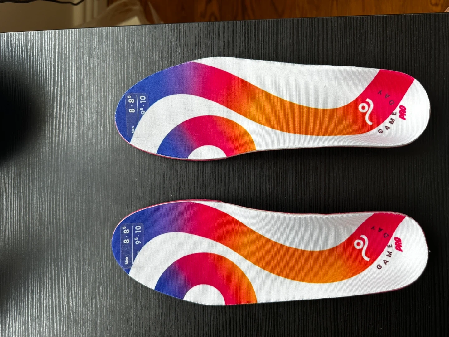 OOFOS Game Day Pro insoles provide support and comfort for your feet. They're designed for active individuals and come in a vibrant pink and black colourway. This pair is a size 8-10.