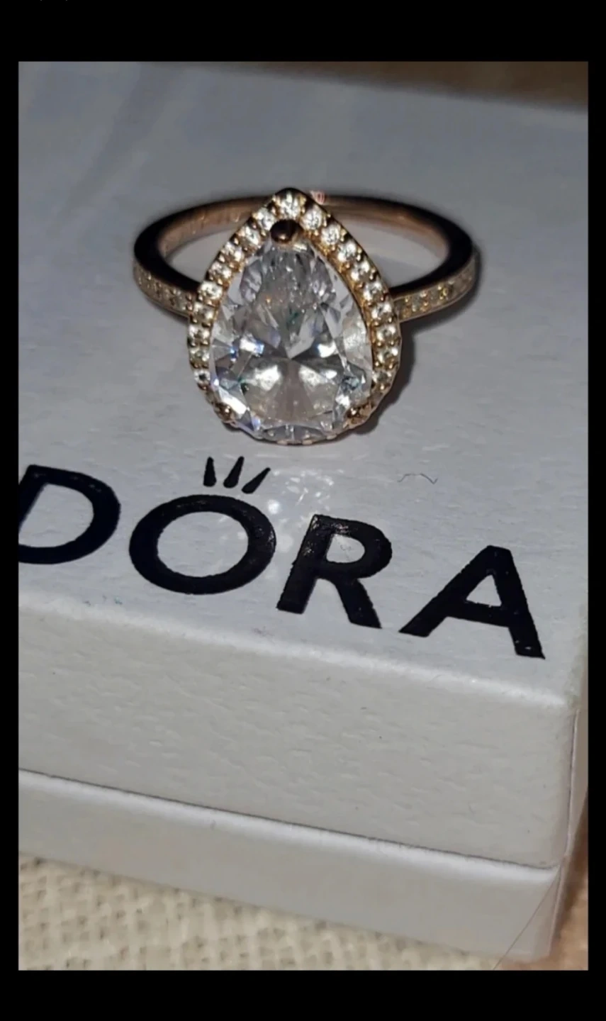 This stunning Pandora ring features a pear-cut centre stone surrounded by a halo of smaller stones. The band is also accented with delicate sparkling stones. It's crafted in a rose gold tone metal. It would make a beautiful engagement or statement ring!