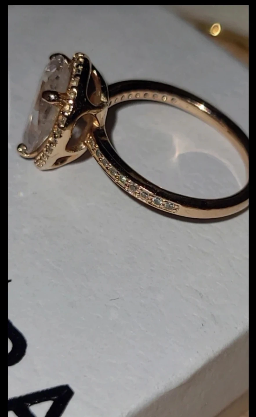 This stunning Pandora ring features a pear-cut centre stone surrounded by a halo of smaller stones. The band is also accented with delicate sparkling stones. It's crafted in a rose gold tone metal. It would make a beautiful engagement or statement ring!