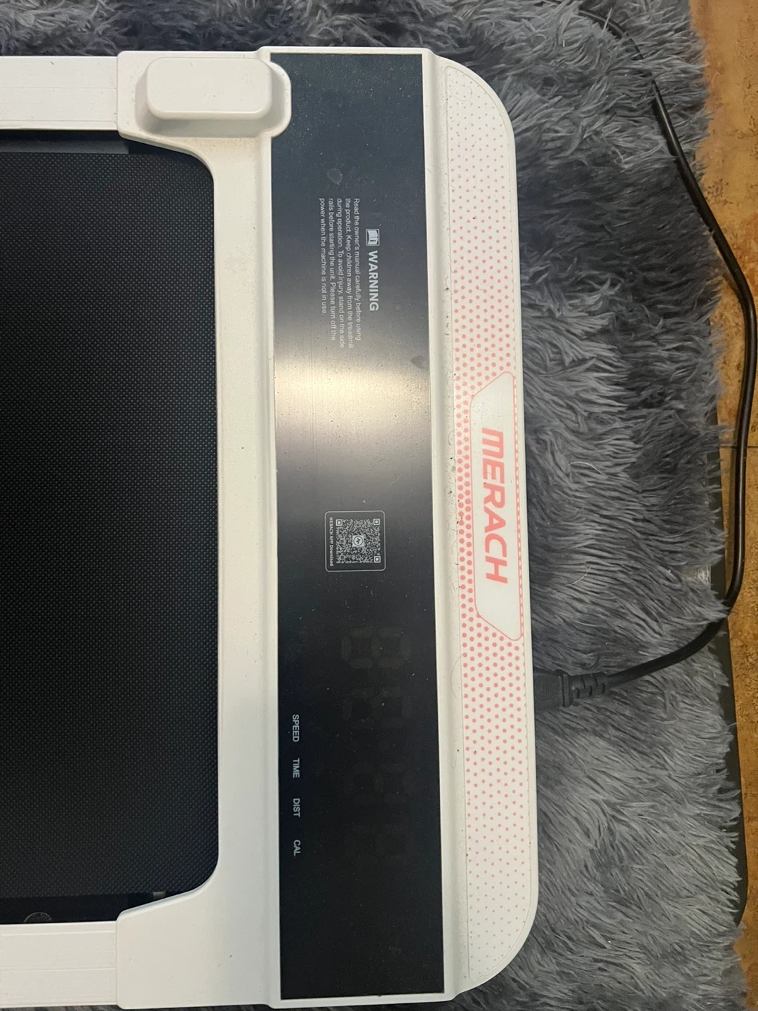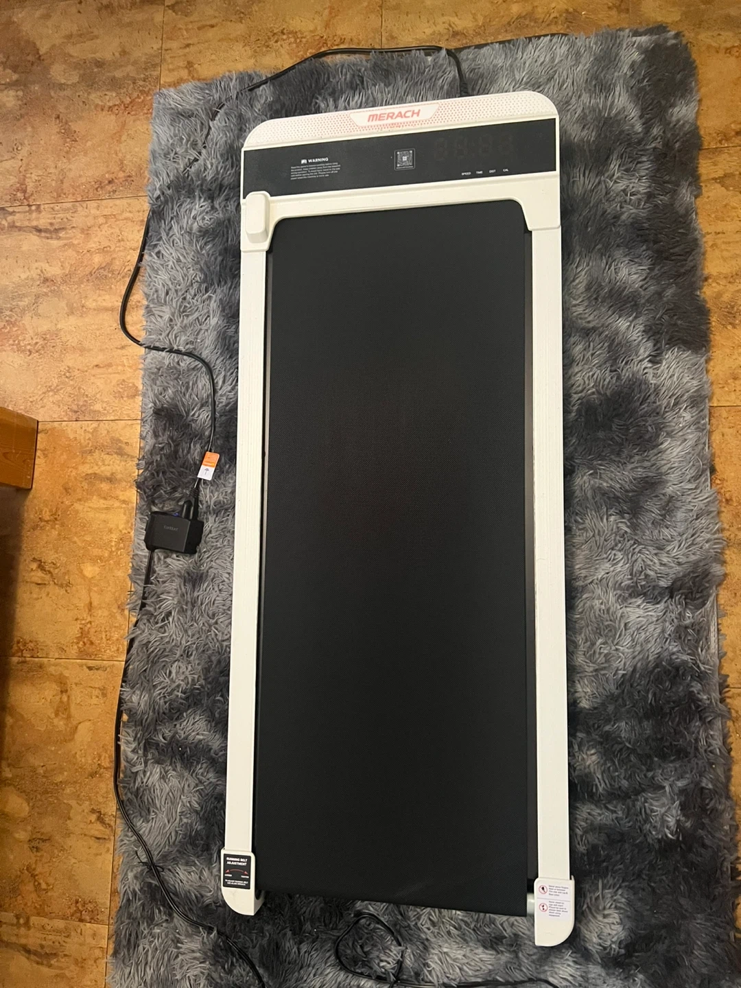 This is a MERACH under-desk treadmill. It's designed for walking or light jogging. Its compact size makes it easy to store and use at home or in an office.