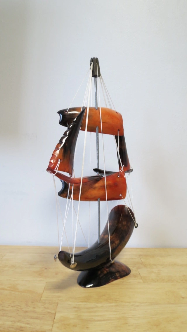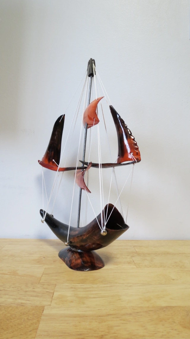This is a beautiful, model ship made from polished horn. It features striking colors ranging from deep black to warm amber and orange, making it a unique decorative piece for any home or office. Features: Design: Intricate multi-sail ship with white rigging and a sturdy horn base. Condition: Great vintage condition. No cracks or chips; rigging is secure. Size: Perfect for a shelf, desk, or mantel display. A perfect gift for maritime lovers or collectors of unique folk art! Cash accepted.
