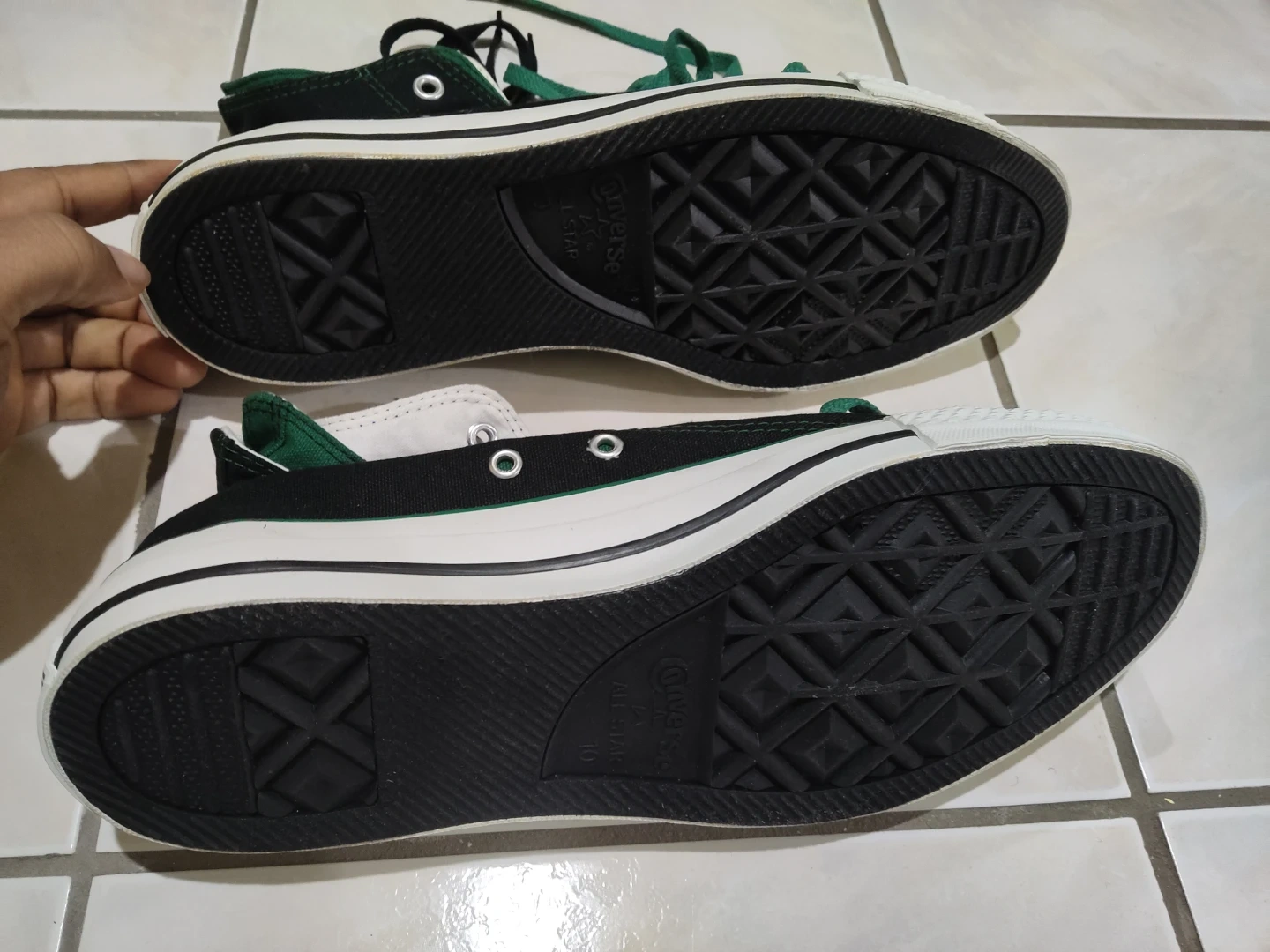 Classic black and green Converse All Star high-top sneakers. Features the iconic Chuck Taylor ankle patch and rubber toe cap. Canvas upper with rubber sole.