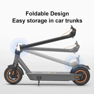 This is a Hiboy S2 MAX electric scooter. It features a foldable design for easy storage in car trunks. The scooter has orange accents on the wheels.