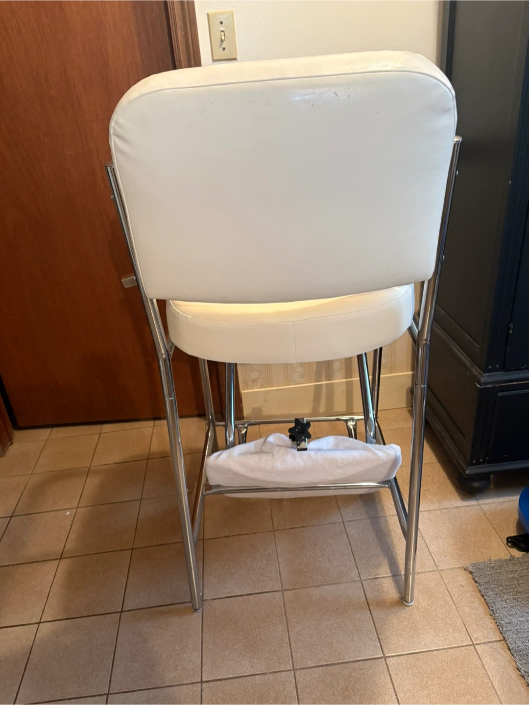 Pedicure chair featuring a chrome frame and white leather upholstery. It has a retro design with armrests and a footrest. This chair would be perfect for a salon.