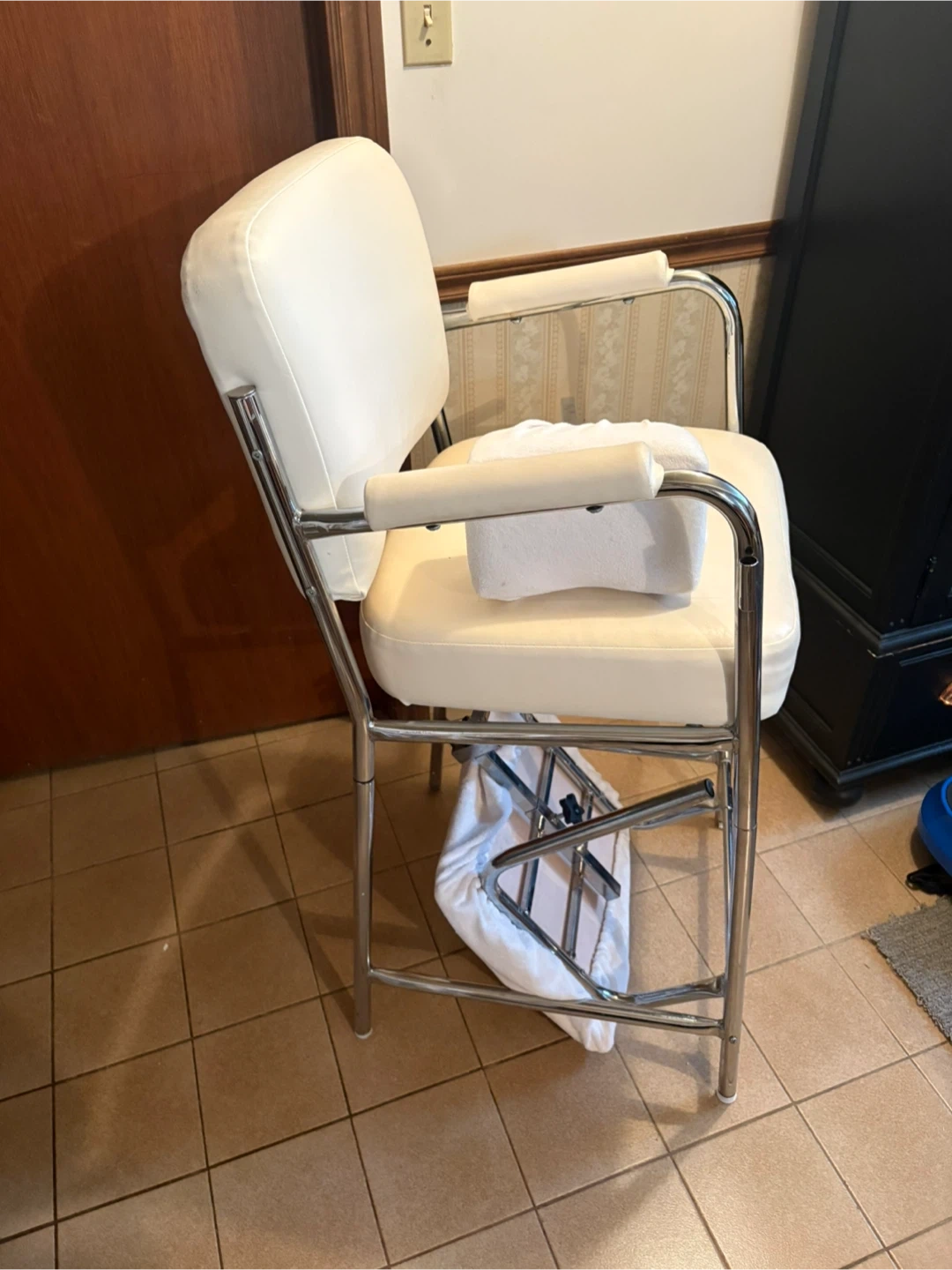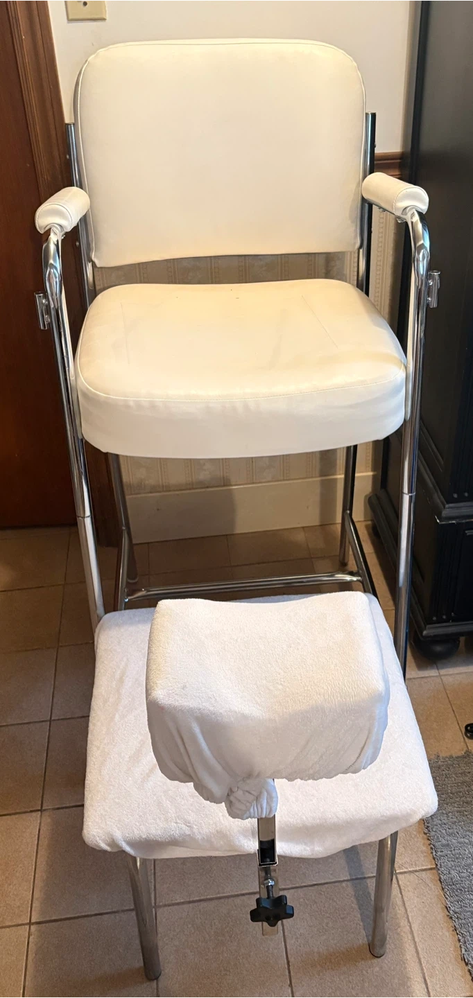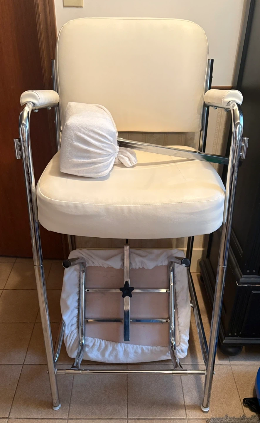 Pedicure chair featuring a chrome frame and white leather upholstery. It has a retro design with armrests and a footrest. This chair would be perfect for a salon.