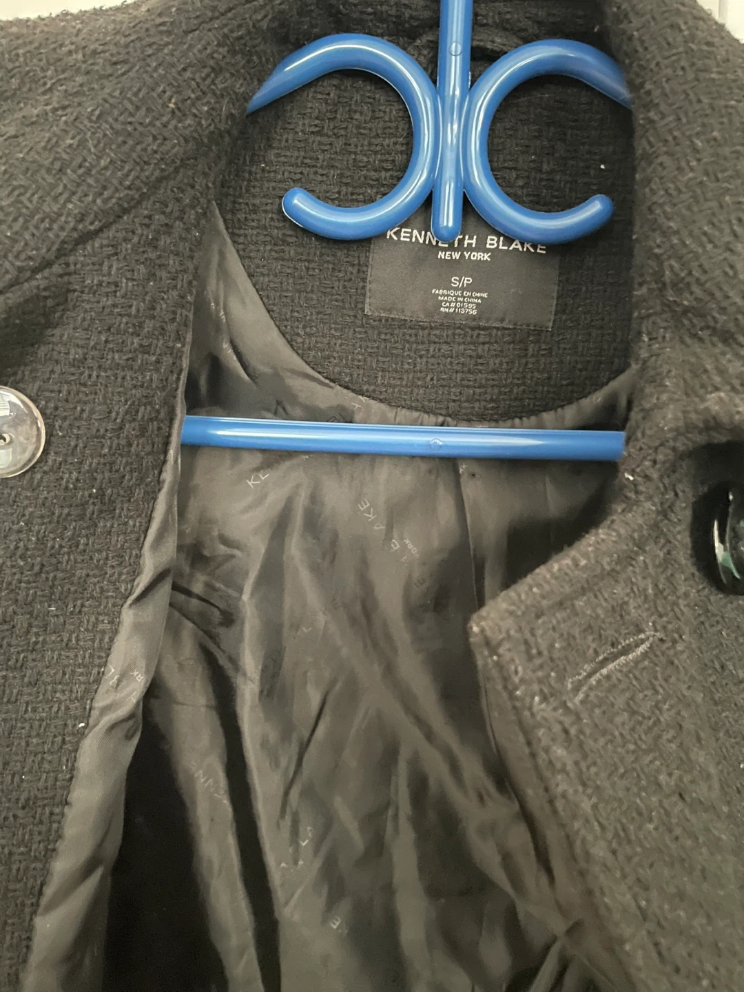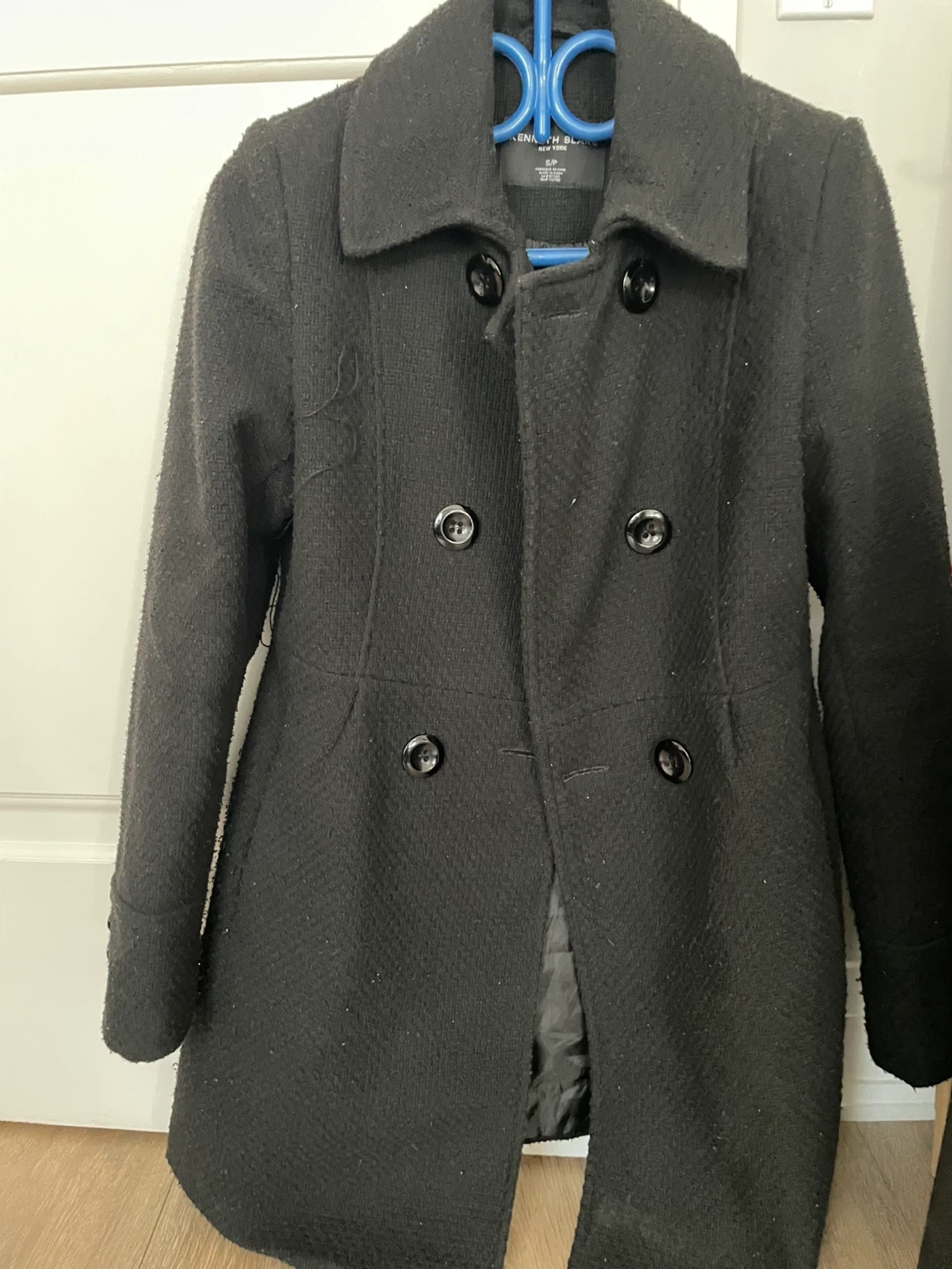 This black coat is from Kenneth Cole New York. It's a size S/P. Double-breasted with button closure. It's made of a wool blend fabric.