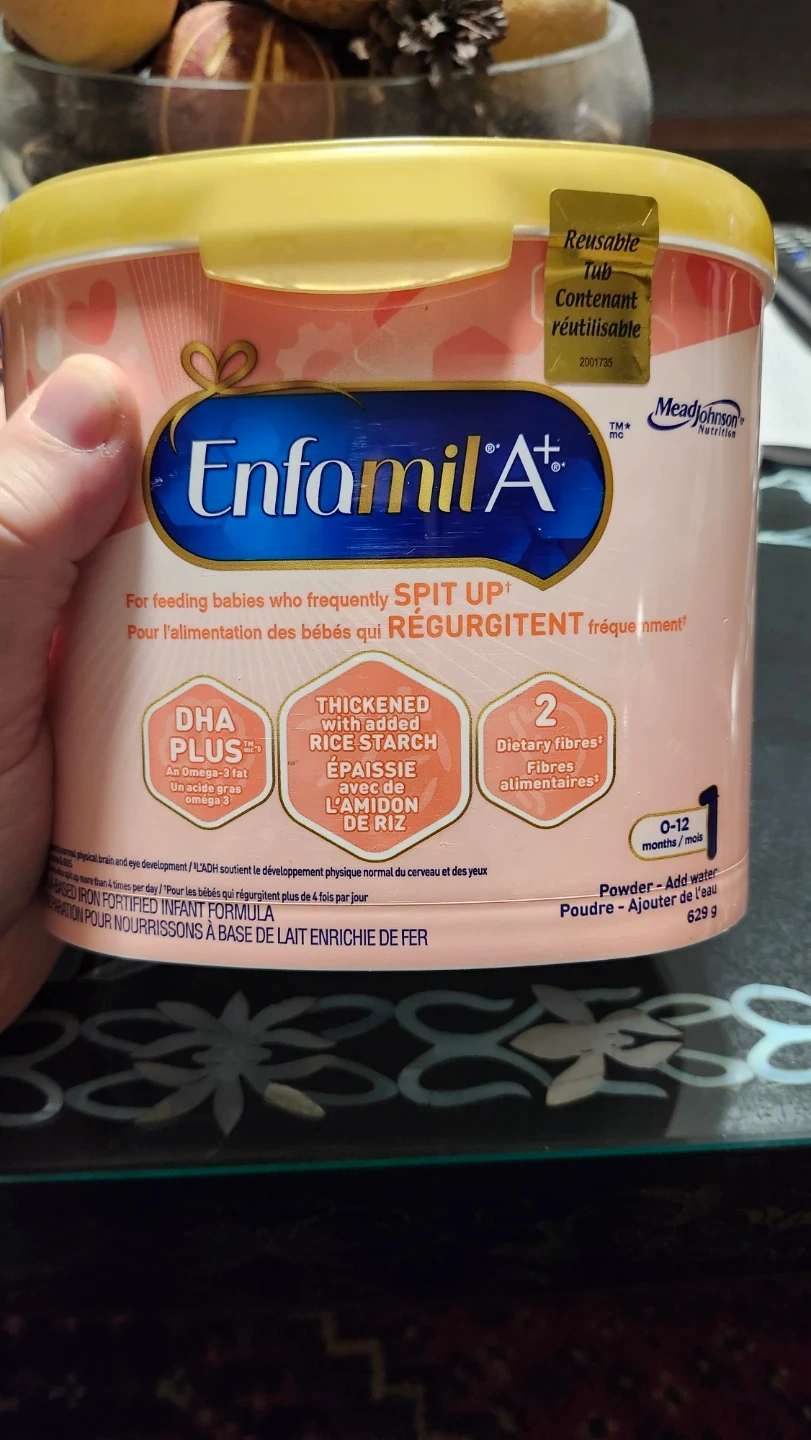 Selling a container of Enfamil A+ infant formula. It's for babies 0-12 months. Expiry Date: 2027 January 01. For feeding babies who frequently spit up! It's thickened with added rice starch and has 2 dietary fibres