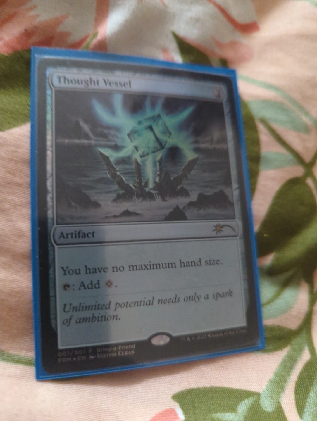 Thought Vessel is an artifact card from Magic: The Gathering. It allows players to have no maximum hand size. The card's text reads, 'Unlimited potential needs only a spark of ambition.' This specific card is numbered 001/001 and is part of the Bring-a-Friend set.