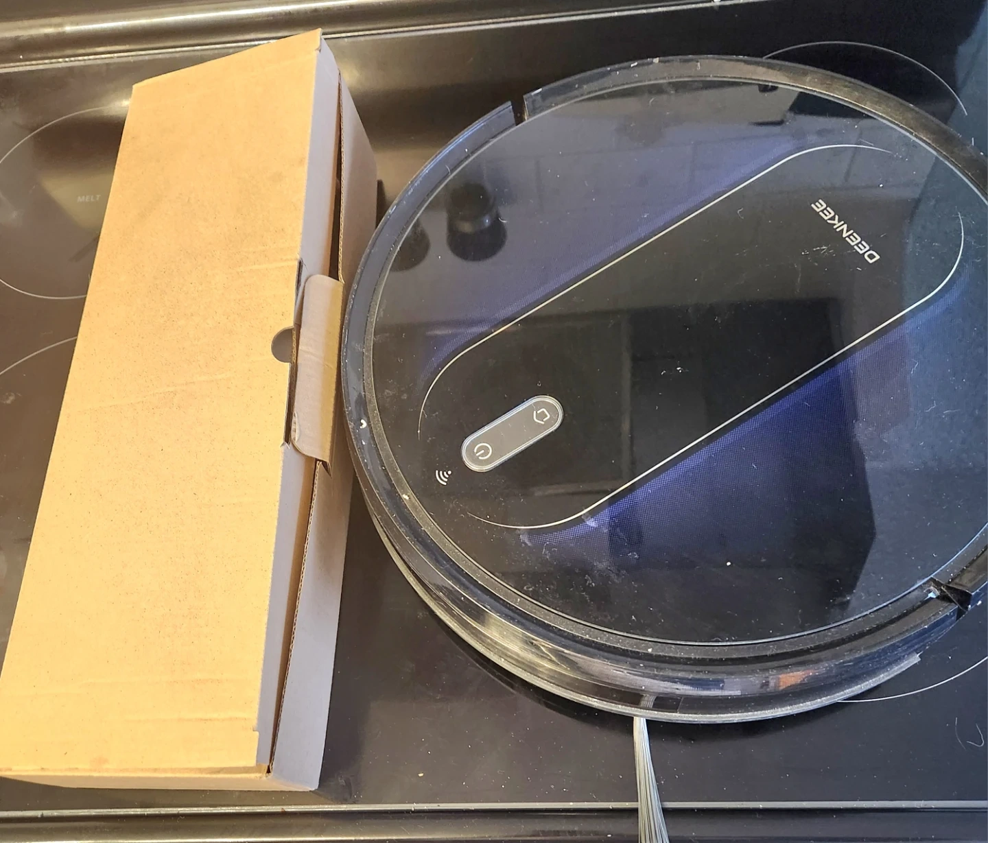 This is a DEENKEE robot vacuum. It includes the original box. This device is designed to autonomously clean your floors. Vacuum and wash, come with two mop heads and wireless. Great machine